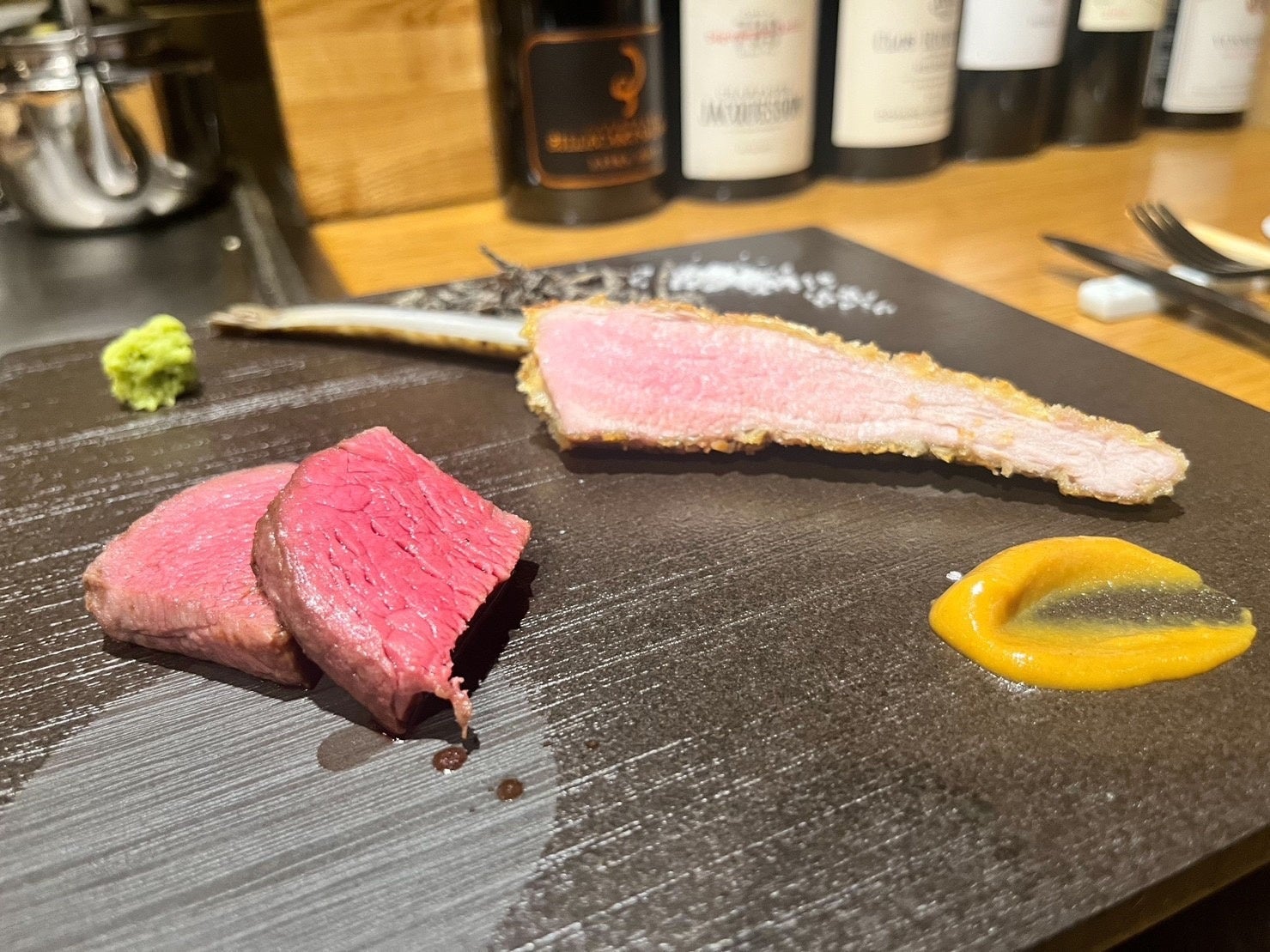 「入手困難の美熊野牛を6時間低温調理。豚ヒレも2時間低温調理の後に鉄板でカツレツにしてある」