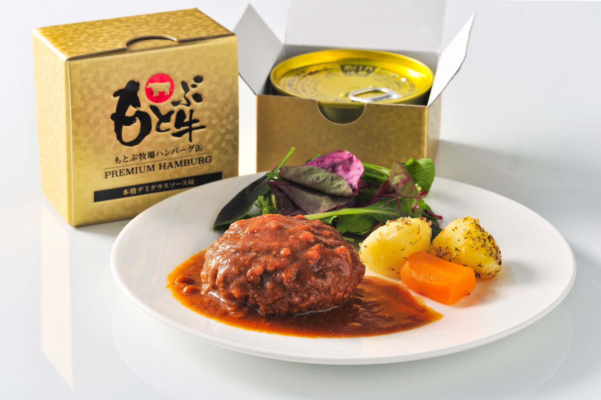 【もとぶ牧場ハンバーグ缶】は、自然豊かな沖縄島北部のやんばる地域で豊かな自然と人の愛情でのびのびと育てられた、沖縄ブランド黒毛和牛「もとぶ牛」を使用した贅沢なハンバーグの缶詰です。既存の冷凍ハンバーグもご好評をいただいておりますが、今回は缶詰にし、常温で3年間も日持ちする商品に仕上げました。