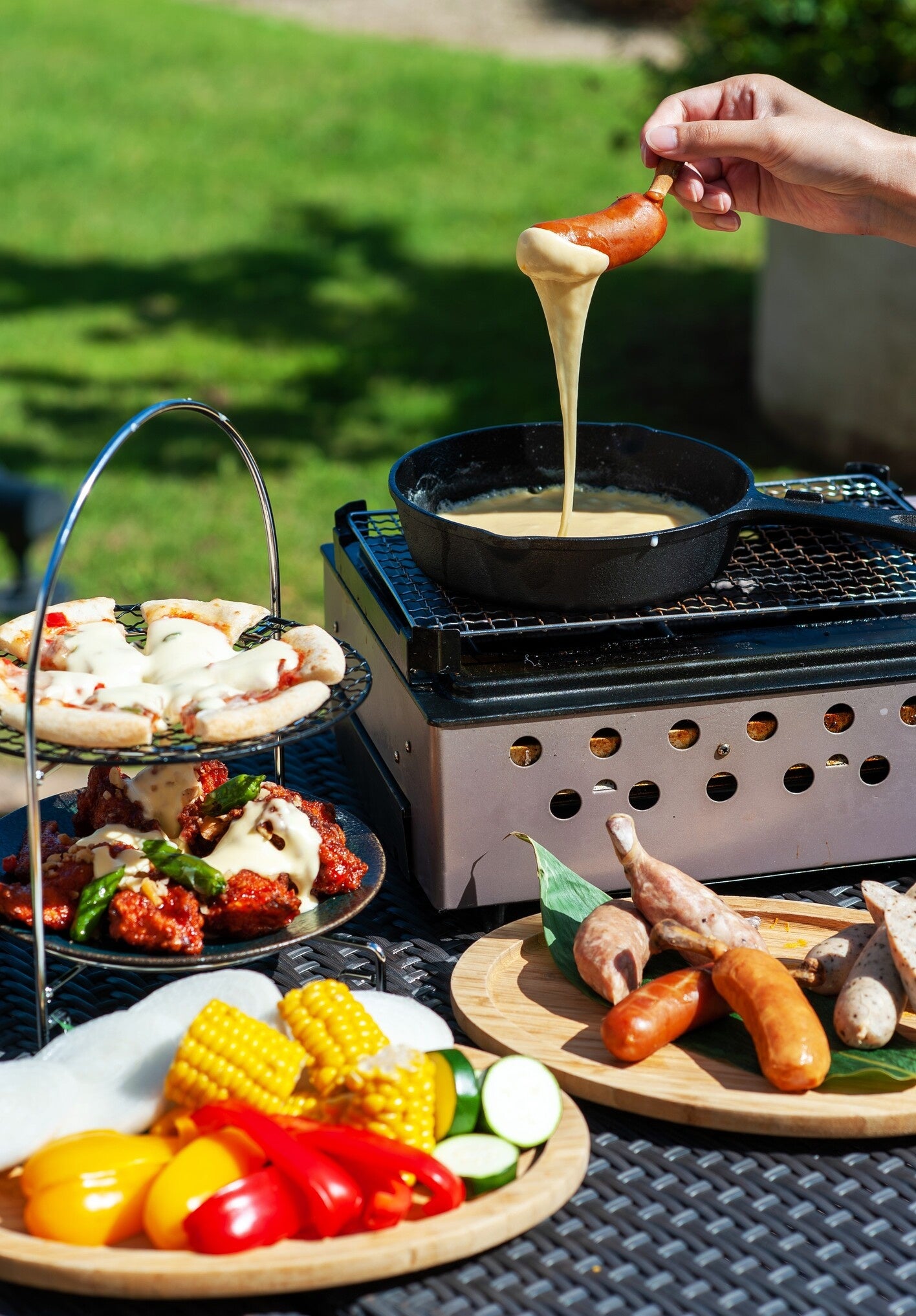 特にオススメしたいのは、ピザとヤンニョムチキンの「チーズマウンテン」です。ピザとヤンニョムチキンは、受け皿が網になったティアードスタンドで提供し、仕上げに熱々のとろけるチーズをおかけします。