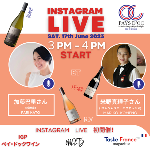 米野さん、巴里さんへの質問やIGPペイ・ドックワインに関する質問を、事前にTaste France Magazine 公式Instagramで募集しますので、是非コメントを寄せていただき、インスタライブにご参加ください。