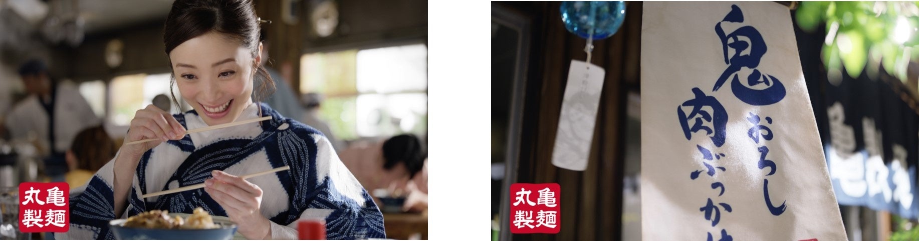 新TVCM「のどごしつるん!鬼おろし肉ぶっかけ」篇では、夏らしい浴衣姿の上戸さんが讃岐の原風景をイメージした製麺所で『鬼おろし肉ぶっかけうどん』をつるんと頬張り、おいしそうに食べる姿をお届けします。
