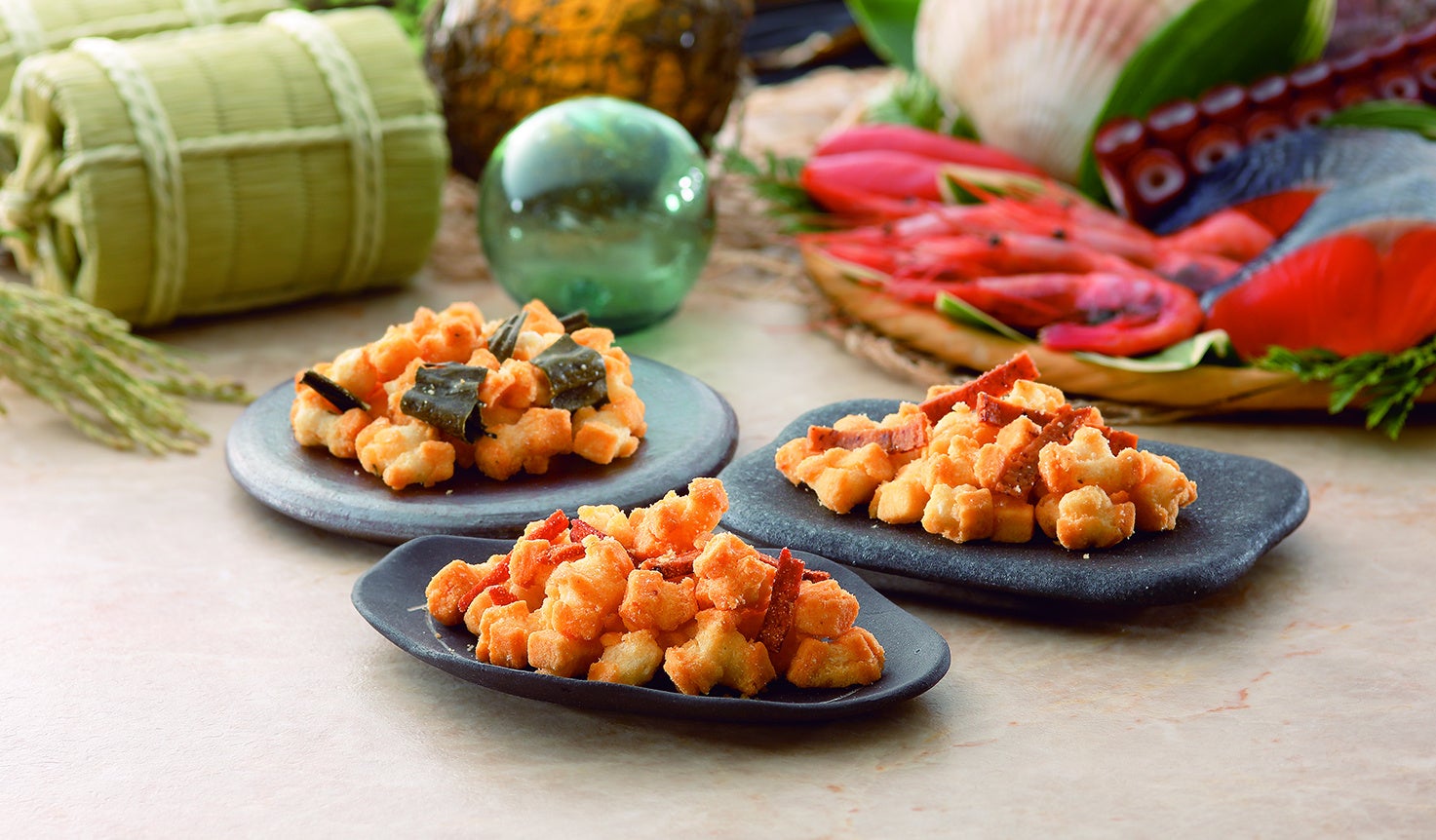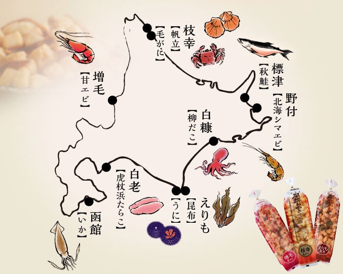 現在は「標津秋鮭」(2005年4月発売)、「枝幸帆立」(2006年7月発売)、「野付北海シマエビ」(2008年3月発売)、「増毛甘エビ」(2008年10月発売)、「えりも昆布」(2009年12月発売、1994年11月発売の「昆布しょうゆ味」からのリニューアル)、「松前いか」(2010年4月発売、1996年発売の「いか味」からのリニューアル、2017年11月には「函館いか」にリニューアル)、「白糠柳だこ」(2014年1月発売)、「白老虎杖浜たらこ」(2015年4月発売)、「函館いか」(2017年11月発売、2010年4月発売の「松前いか」からのリニューアル)、「枝幸毛がに」(2019年4月発売)、「えりもうに」(2020年4月発売)と10種類を展開しております。(*「野付北海シマエビ」、「枝幸毛がに」、「えりもうに」は期間限定で展開)