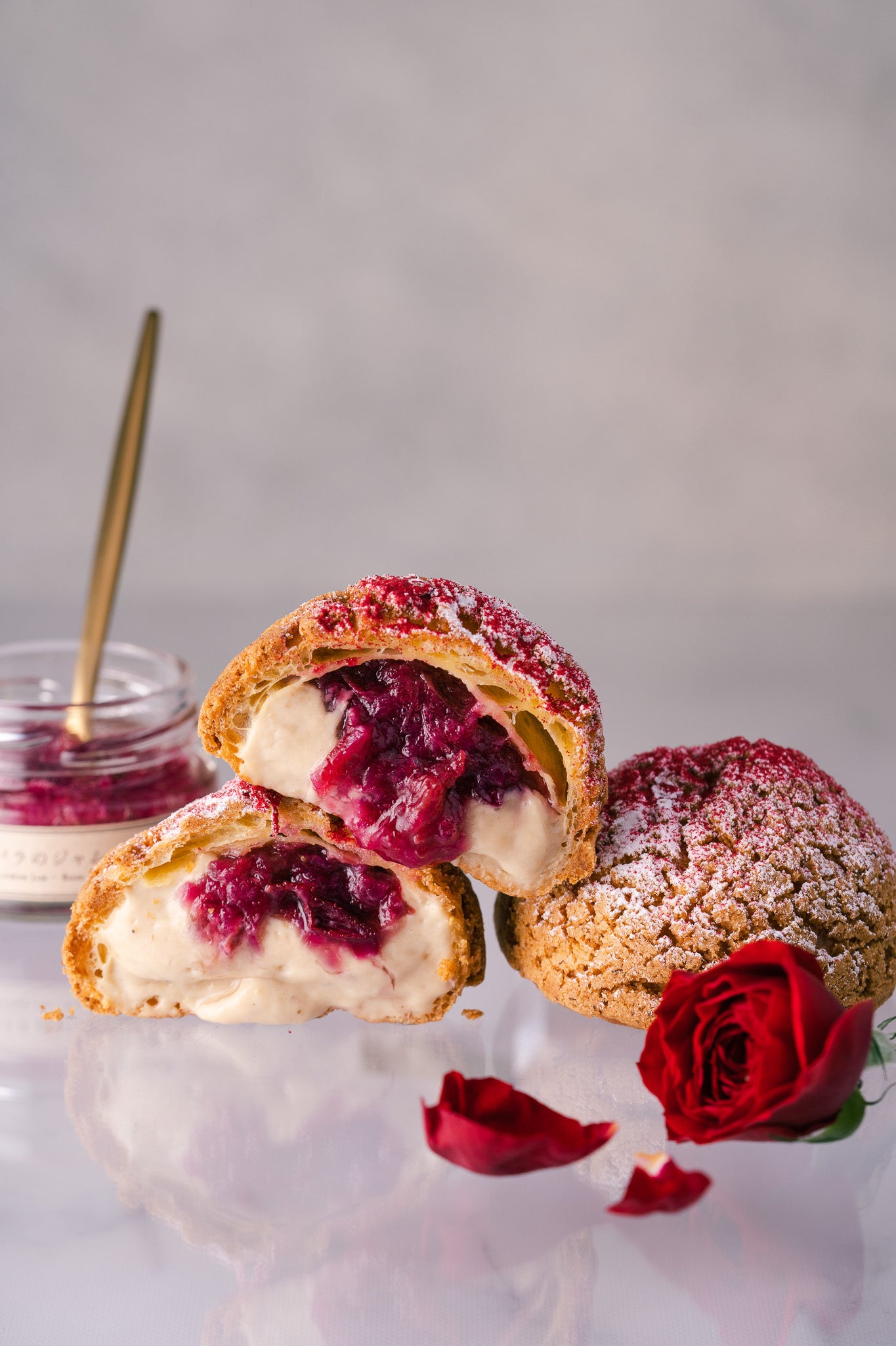香りをテーマにした茗荷谷のパティスリー<Pâtisserie L’essentielle(パティスリー レセンシエル)>と、”食べられる花”エディブルフラワーの専門店「エディブルフラワーガーデン」とのコラボスイーツ。<Pâtisserie L’essentielle(パティスリー レセンシエル)>のスペシャリテ、トンカ豆のシュークリームと選び抜かれた国産バラジャムが絶妙にマッチした一品に。今回は店頭での実演・焼きたてを提供します。