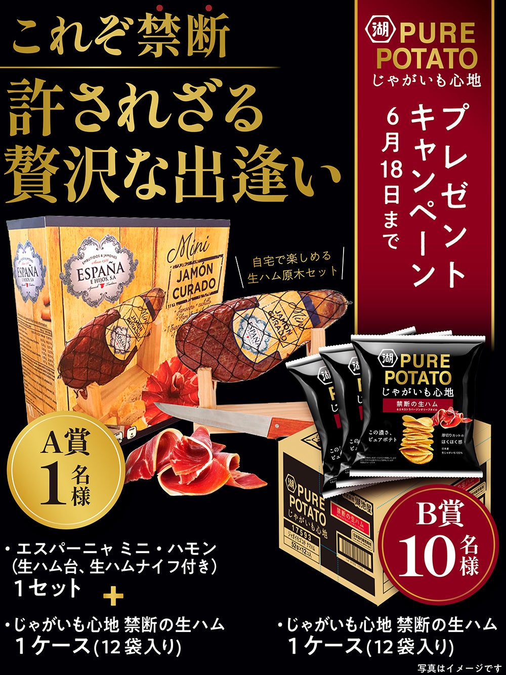 新商品「じゃがいも心地 禁断の生ハム」の発売を記念して、“生ハムとポテト”という許されざる贅沢な出逢いをみなさまに実感していただきたいとの思いから、自宅で楽しめる生ハムの原木セットと商品1箱(12袋入)などをプレゼントするTwitterキャンペーンを実施します。原木セットが当たると、チップスの上から“追い生ハム”も楽しめるこのキャンペーンに、ぜひご応募ください。