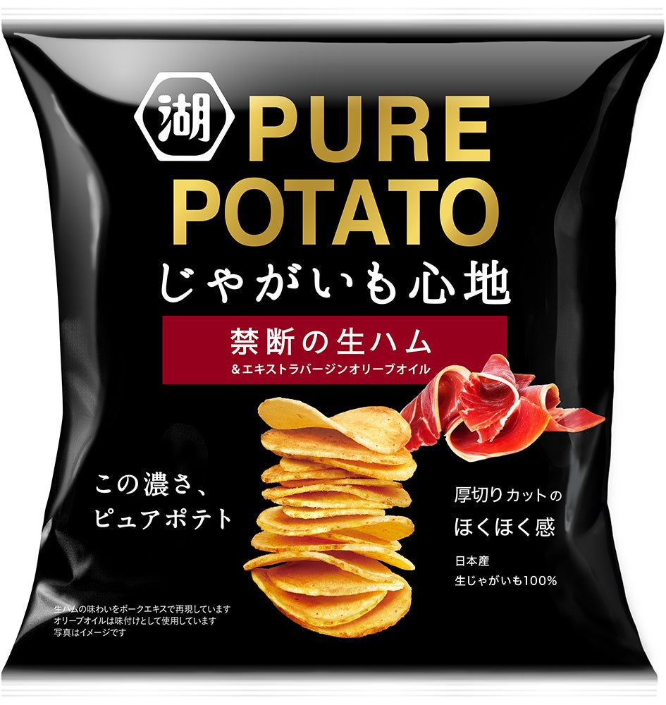 パッケージでは、「PURE POTATO じゃがいも心地」特有の贅沢な厚切りチップスを一枚一枚積み上げて印象的に配置しつつ、ブラックのベースカラーにゴールドのロゴ、ワインレッドの帯を使用し、禁断感あふれる上質なパッケージに仕立てています。また、熟成感のある「生ハム」の写真を使用することで、コク深い味わいを表現しました。