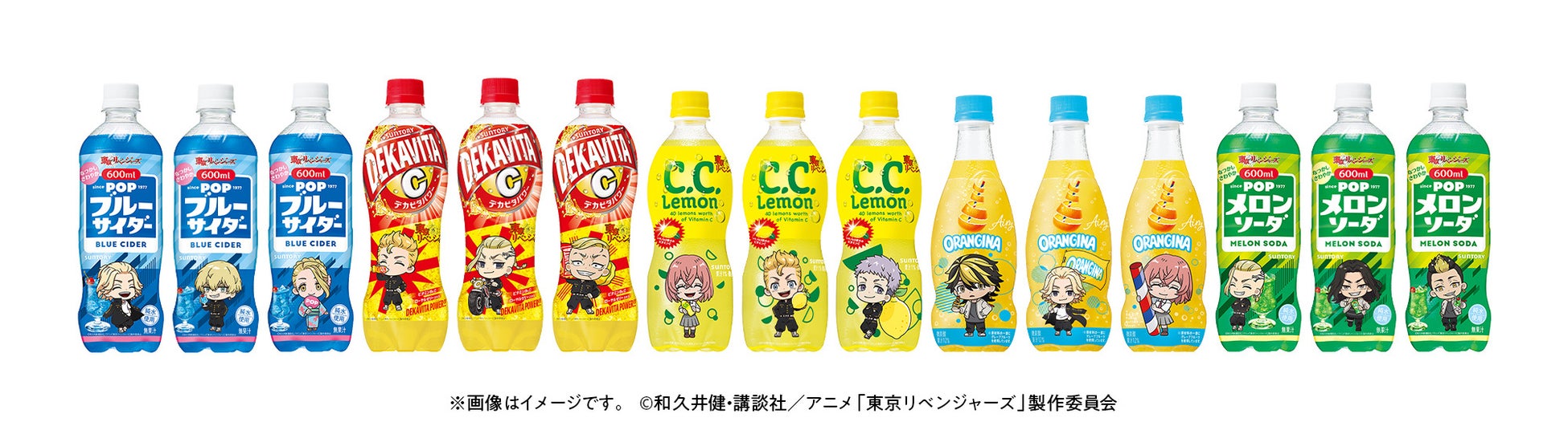 TVアニメ『東京リベンジャーズ』のオリジナルイラストのデザインラベルを「デカビタパワー 500ml」「C.C.レモン 500ml」「オランジーナ エアリー 420ml」「POP メロンソーダ 600ml」「POP ブルーサイダー 600ml」の全15種で展開します。