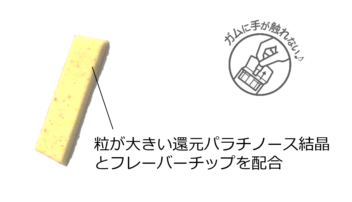 粒が大きい還元パラチノース結晶とはじけるフレーバーチップを配合。ザク&シャリ食感が楽しめます。