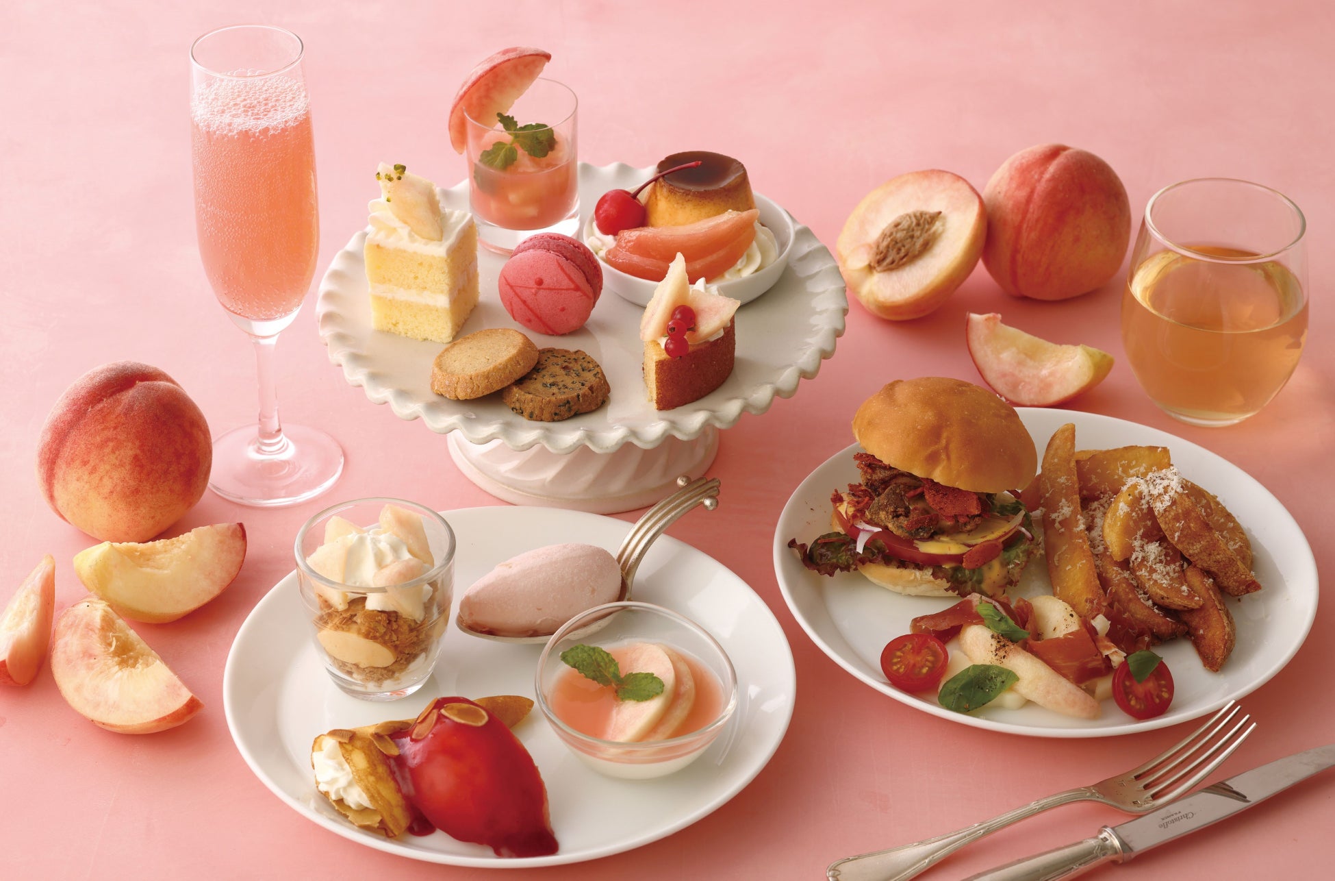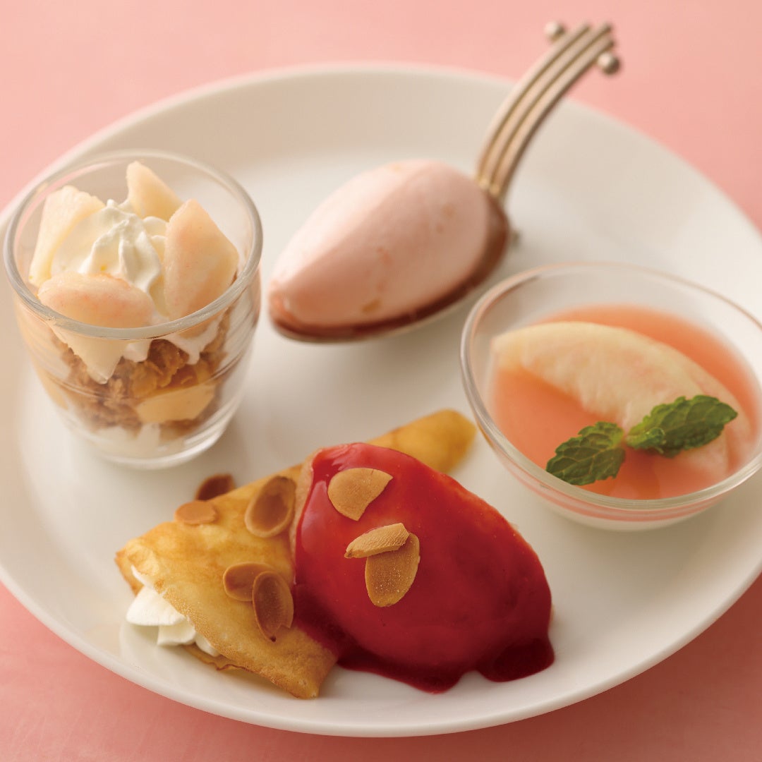 ひとくちサイズの“白桃パイ”をイメージした「白桃のクラムパイ」や軽くマリネした桃を添えた「ピーチメルバクレープ」など、旬にあわせて国内の様々な産地から仕入れたフレッシュな桃を使ったスイーツなど盛り合わせました。