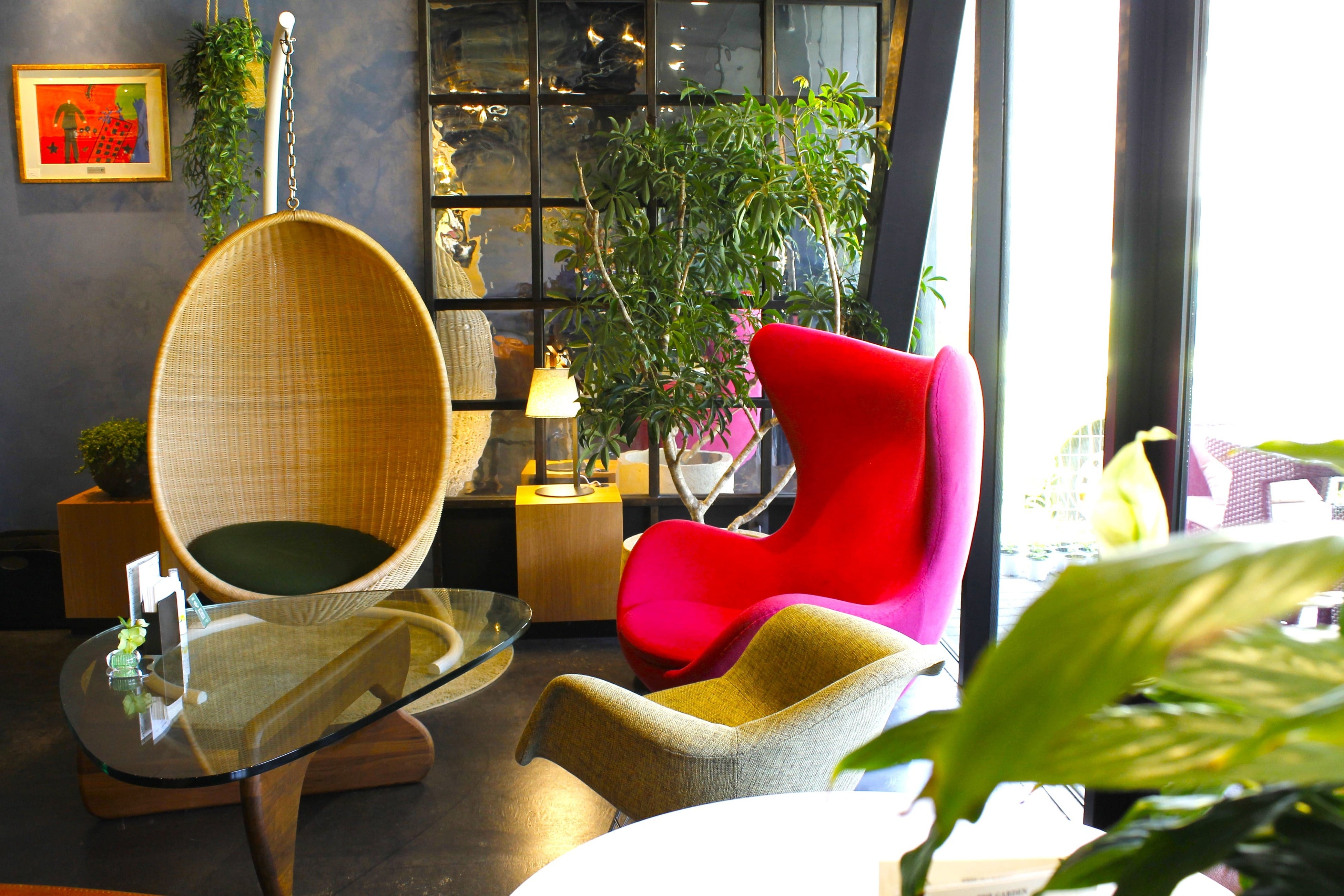 グリーンがいたるところに置かれた、落ち着きある店内。デザイナーズ家具を配したコーナーなどはホテルのラウンジのようです。