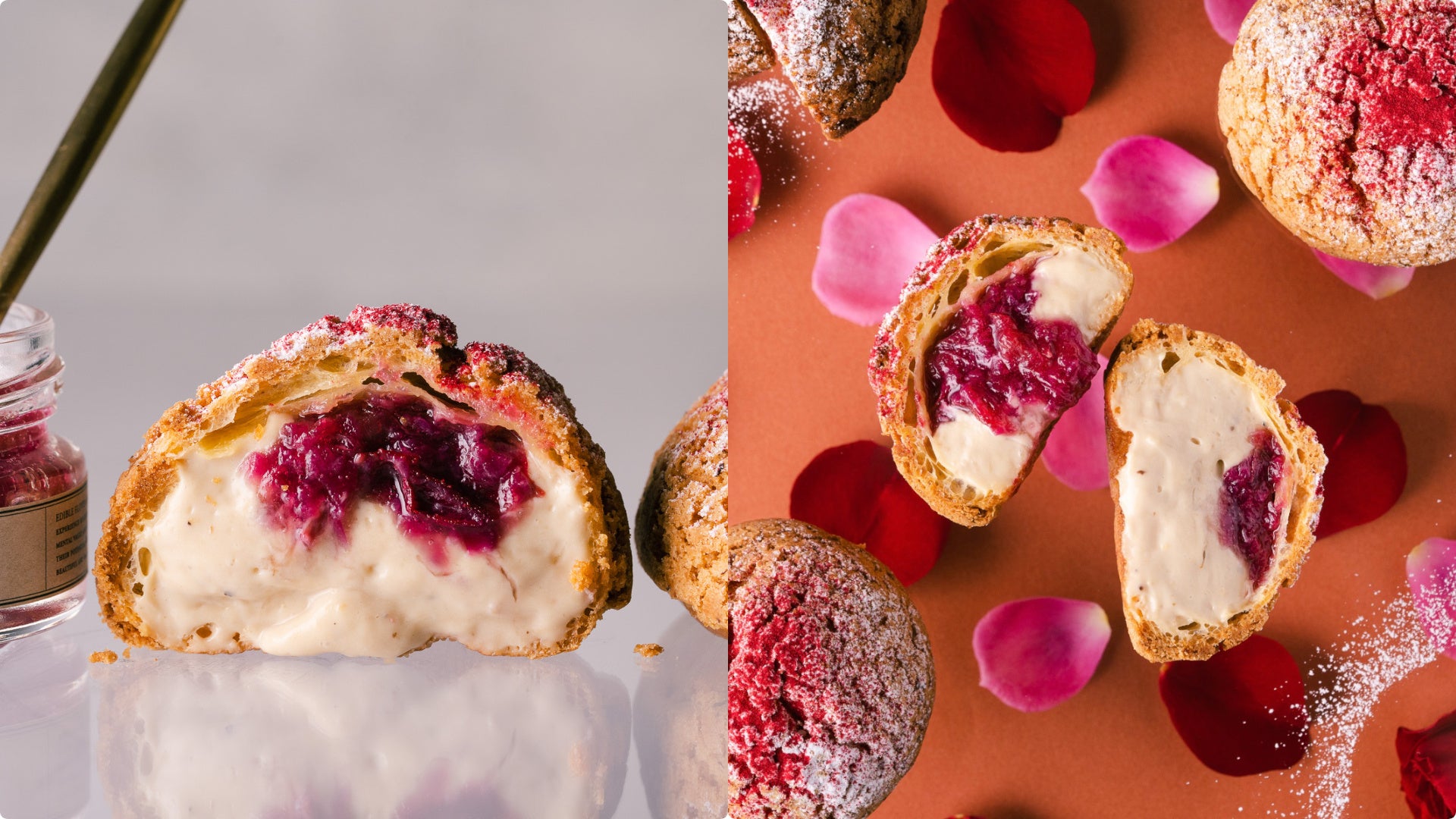 食べられる花屋のスペシャリテの『バラのジャム』と『木苺と赤スグリのピューレ』、『カスタードクリーム』をたっぷりと入れました。木苺が持つ甘酸っぱさ、赤スグリの酸味とわずかな青臭さがバラの香りと相性が抜群。バラの味わいや香りの輪郭をはっきりさせ、味の奥行きと華やかさが広がります。気鋭の若手、カルペディエムの河村シェフとのコラボレーションです。