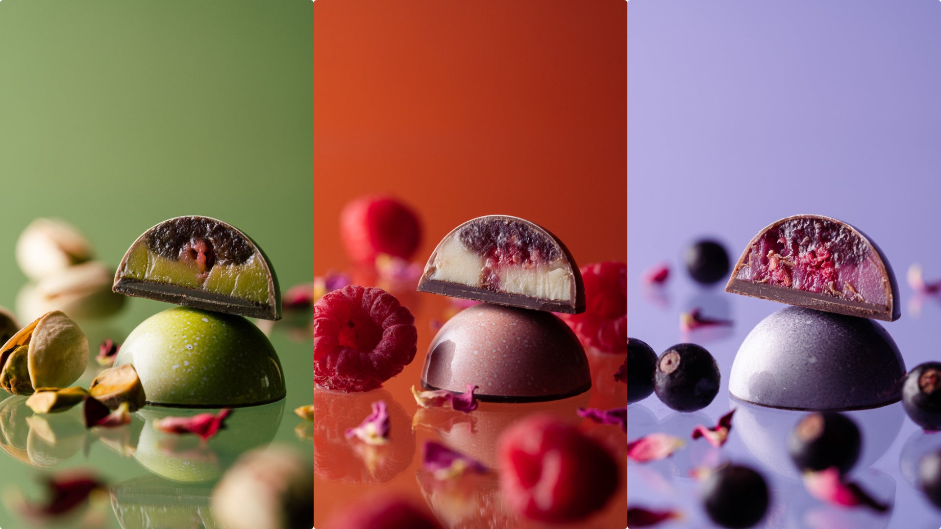 食べられる花屋のスペシャリテ「バラジャム」を使用したボンボンショコラ。バラと相性の良い食材「フランボワーズ」「ライチ」「ピスタチオ」「カシス」「ホワイトチョコレート」を選び、バラジャムと口溶けの良いガナッシュ、2層構造のボンボンショコラに仕立てました。Patisserie Chocolaterie Recitとのコラボレーション。