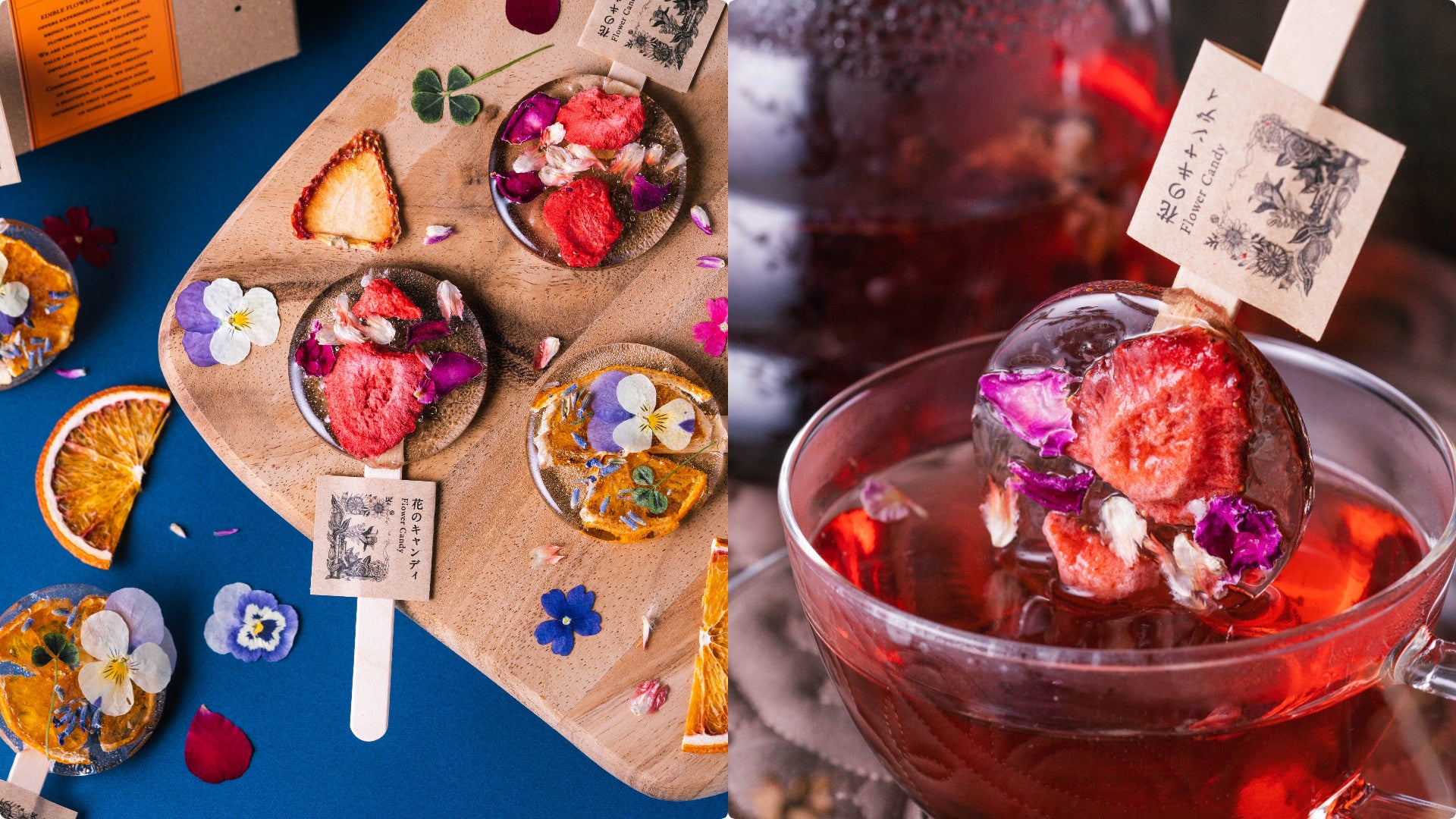 Twitterで700万人以上に拡散した「花のキャンディ」。フレーバーは「ローズ&ストロベリー」。馨しい花の香りとフルーツの爽やかな酸味のハーモニーが楽しめます。紅茶に溶かして、花びらが浮かんだ紅茶と一緒にたのしむのもオススメ。