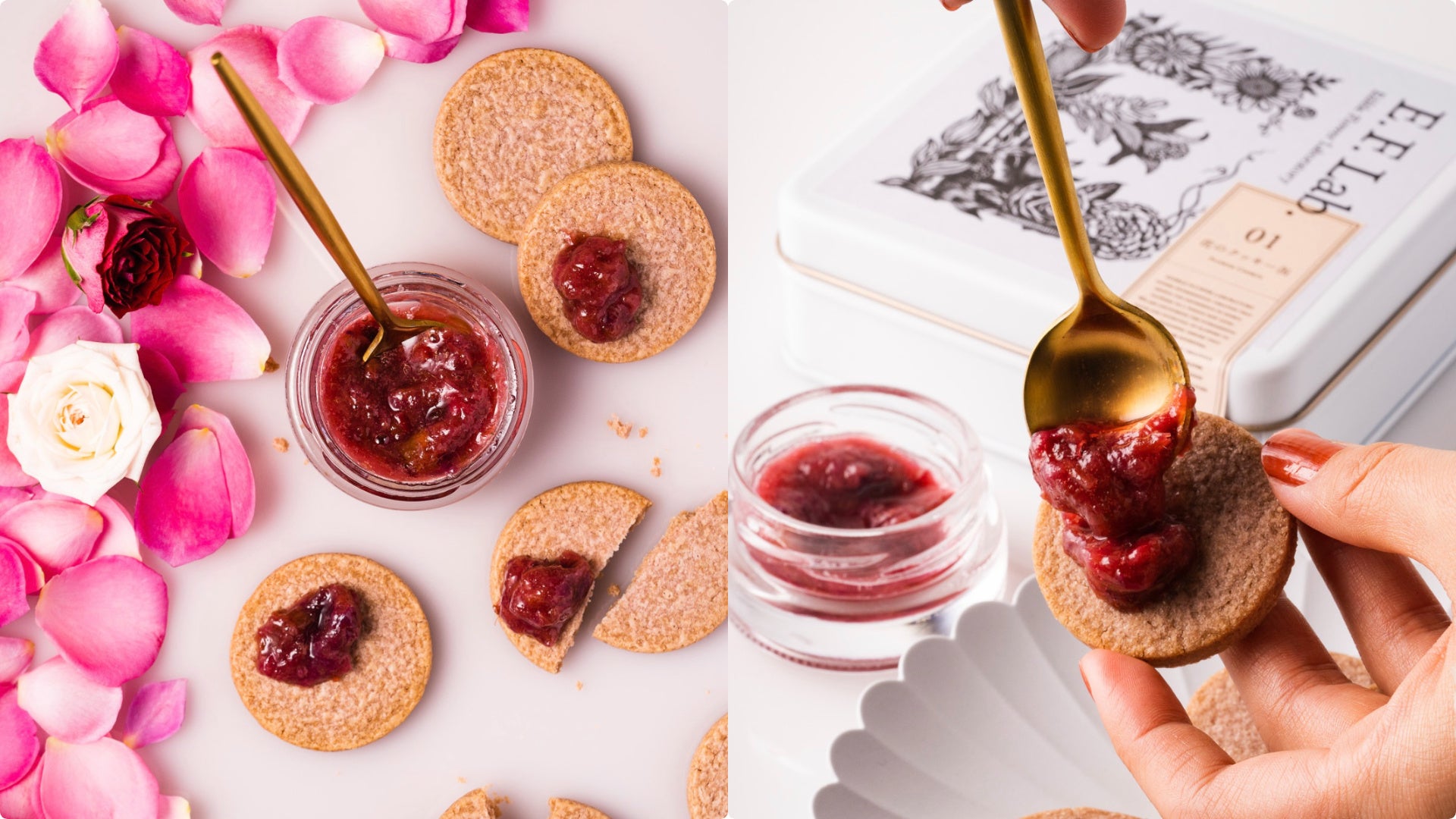 薔薇ジャムをつけてたべるクッキー。食べられる花屋のスペシャリテ「バラジャム」と「バラのクッキー」をセットにしました。ローズパウダーを練り込んだクッキーに薔薇ジャムをたっぷりと“あとがけ”。食べると口の中が『薔薇』に包まれる、驚きの体験です。