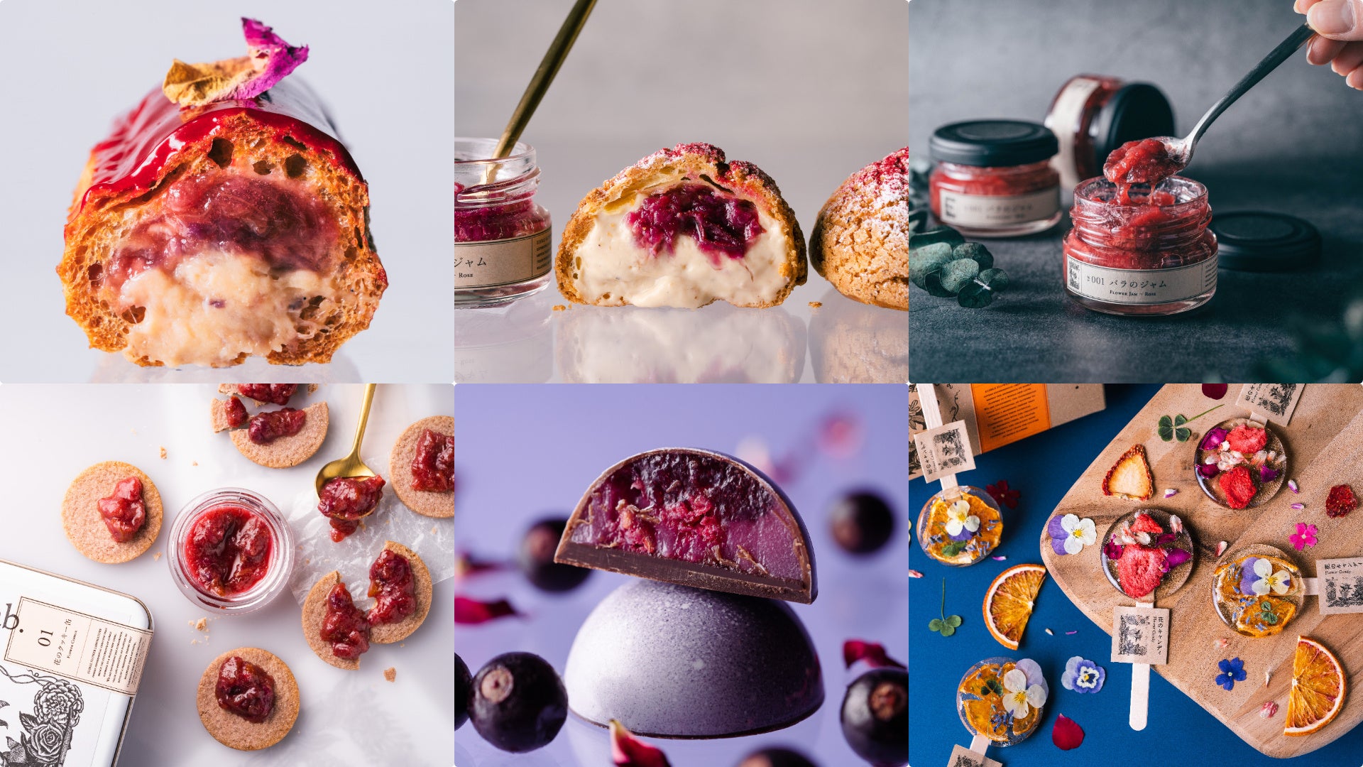 エディブルフラワーの食体験のUP DATEに挑むエディブルフラワー研究所。今回販売するのは「バラのエクレア(972円 税込)」「バラのシュークリーム(972円 税込)」「バラのジャム(税込1,620円)」「花のキャンディ(税込1,512円)」「薔薇のボンボンショコラ(税込3,024円)」「バラジャムのクッキー缶(税込4,104円)」。映えるのはもちろんのこと、しっかりと“おいしい”花のお菓子体験を提案します。