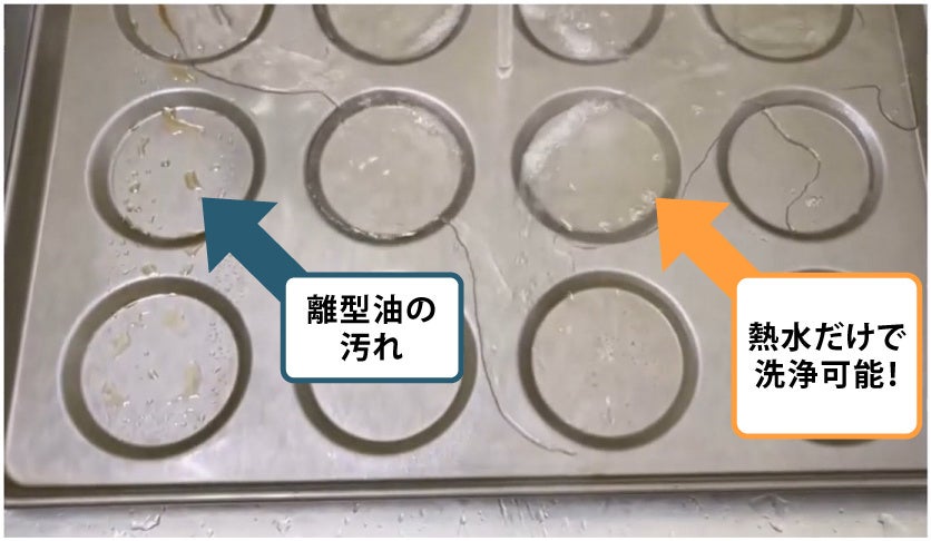 通常、離型油はその名の通り油になじみやすい性質を持っていますが、「離型油すすげるん」は油ではなく水になじみやすいという特長があります。そのため洗剤を使用せずとも、熱水ですすぐだけで簡単に汚れを落とすことができます(特許出願中)。
