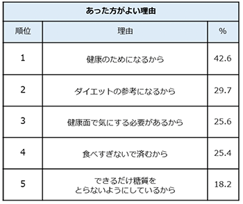 ※「あった方がよい理由」で提示した選択肢:ダイエットの参考になるから、食べすぎないで済むから、健康のためになるから、健康面で気にする必要があるから、できるだけ糖質をとらないようにしているから、できるだけ脂質をとらないようにしているから、足りない栄養素を後で補えるから、その他、特にない