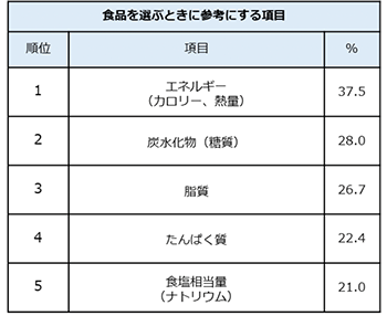 ※提示した選択肢:エネルギー(カロリー、熱量)、たんぱく質、脂質、炭水化物(糖質)、食塩相当量(ナトリウム)、コレステロール、カフェイン、グルテン、水分