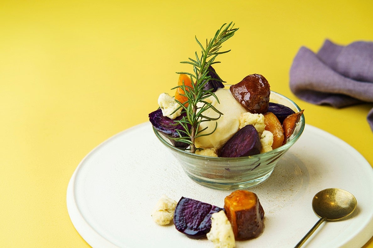 フリットにした紅芋と黄金芋、2種類の芋を黒糖ソースに絡めて大学芋に仕立てました。芋の下には、ミルクのジェラートが隠れた温かくて冷たいパフェ仕立てのスイーツです。ほくほくとした紅芋に黒糖の香りと旨味、まろやかなミルクで、芋の味わいを引き立てます。