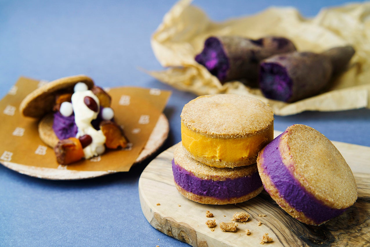沖縄土産で親しまれているお菓子「ちんすこう」を薄焼きにして、オリジナルの芋餡をサンドしました。芋餡は、優しい甘みとほっこりとした芋の風味が特徴の「紅芋」と「」の愛称で親しまれるネットリとした食感で、鮮やかなオレンジ色のイモの 2 種類を用意しました。芋餡には、爽やかなマスカルポーネチーズをあわせ、柔らかく炊いた金時豆とちんすこうのサクサクとした食感も楽しいスイーツです。