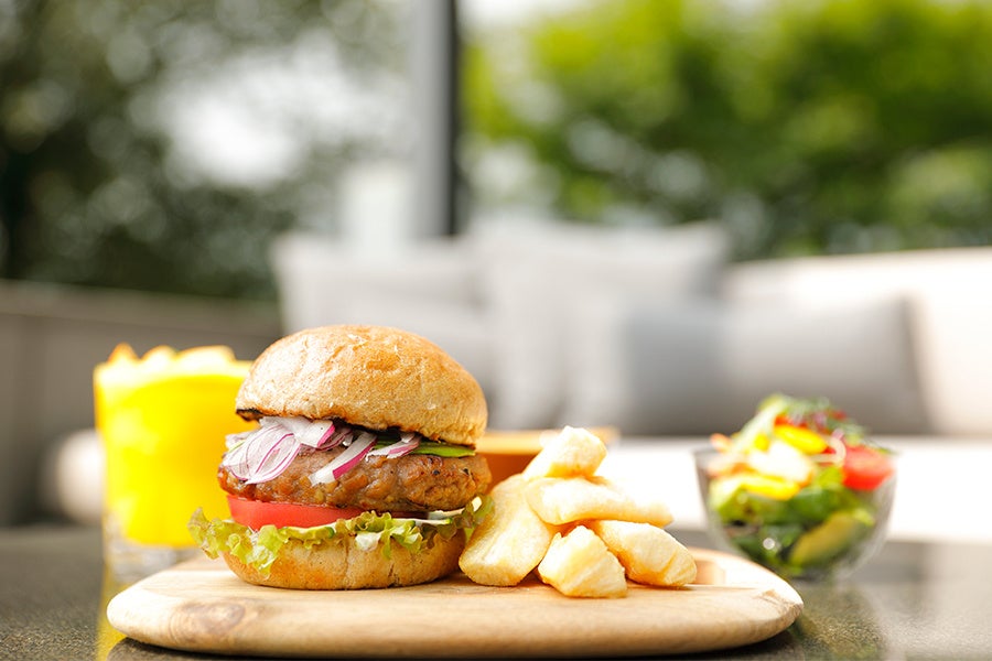 「SPICY VEGAN BURGER」は、たっぷりの野菜に、低カロリーの大豆ミートとスパイシーチリソースを使い、健康やサステナブルに関心がある方にも、ヘルシーさと環境に配慮したおすすめの一品。