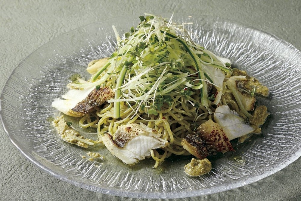 「長崎県産活〆穴子の冷製ジェノベーゼ」は、冷たいジェノベーゼに弾力のある穴子を合わせ、グリーンオリーブで仕上げたタブナードソースと一緒に味わう爽やかな一皿です。