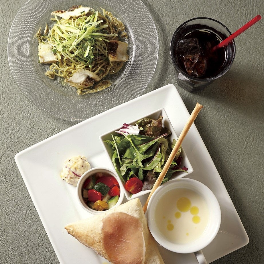 ワンプレートに盛り込んだ前菜5種、長崎県産活〆穴子の冷製ジェノベーゼ ハーフサイズ、ドリンク