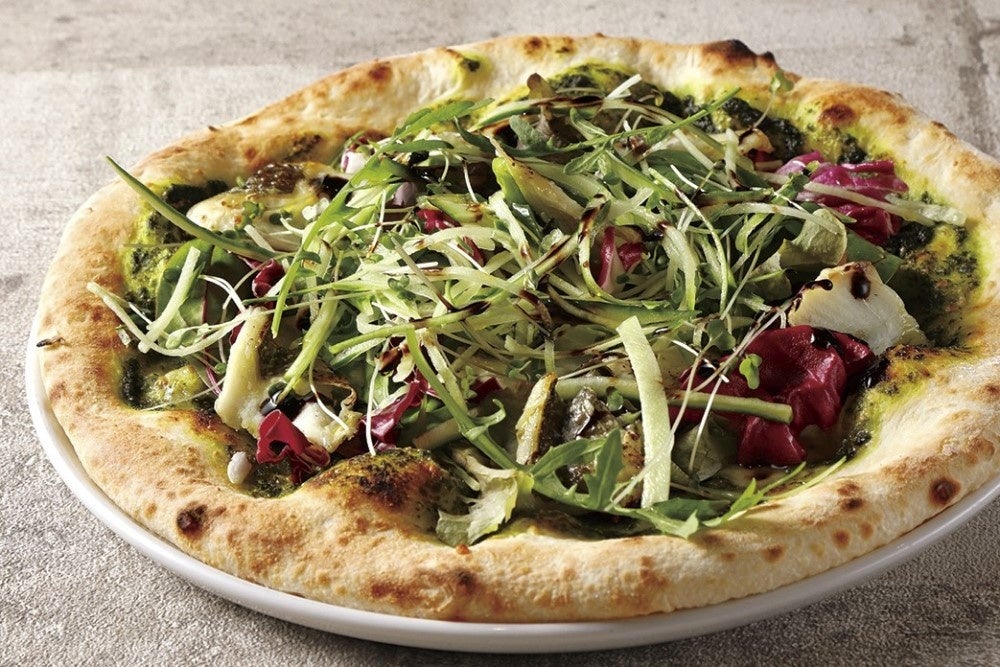 野菜の食感とバルサミコがアクセントの「長崎県産穴子のピッツァ・ジェノベーゼ」は、新鮮な有機ハーブと穴子で夏らしいサラダ風ピッツアに。