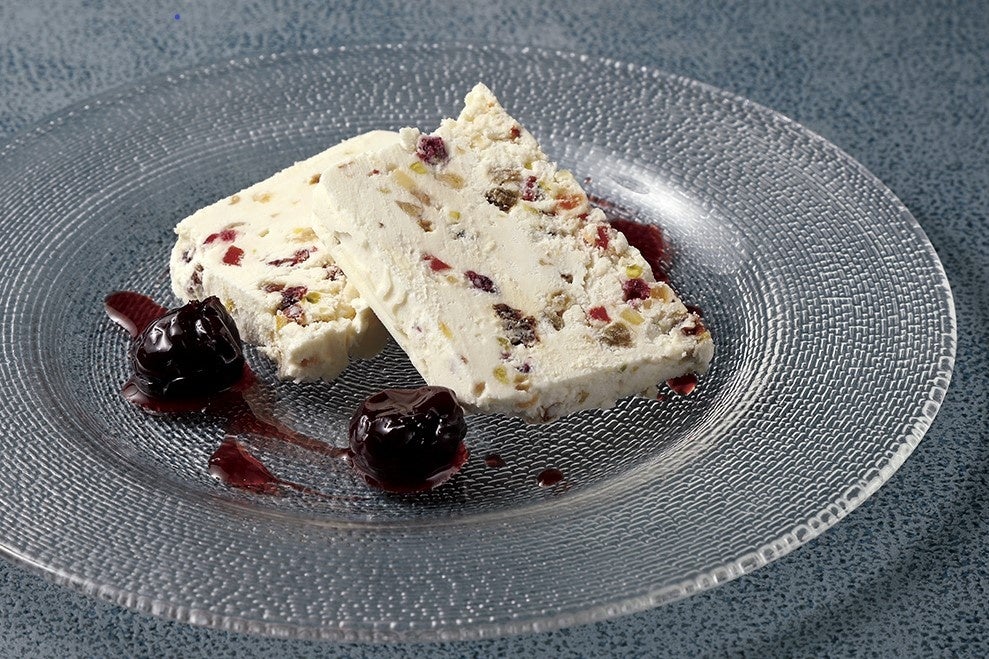 食後やティータイムは、シチリア島の伝統的なアイスケーキ「自家製カッサータ チェリーのコンフィチュール」をご用意しております。ナッツとドライフルーツをふんだんに合わせ、アメリカンチェリーのソースを添えて初夏ならではの一品に。
