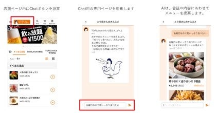 本機能は、「ChatGPT」を活用して「ぐるなびFineOrder」の注文画面にAIによるチャットボットを実装し、ユーザーが入力した質問に対するメニューレコメンドを中心としたコンシェルジュ機能で、ぐるなび直営の実験店舗で2023年6月26日(月)まで実証実験を行います。