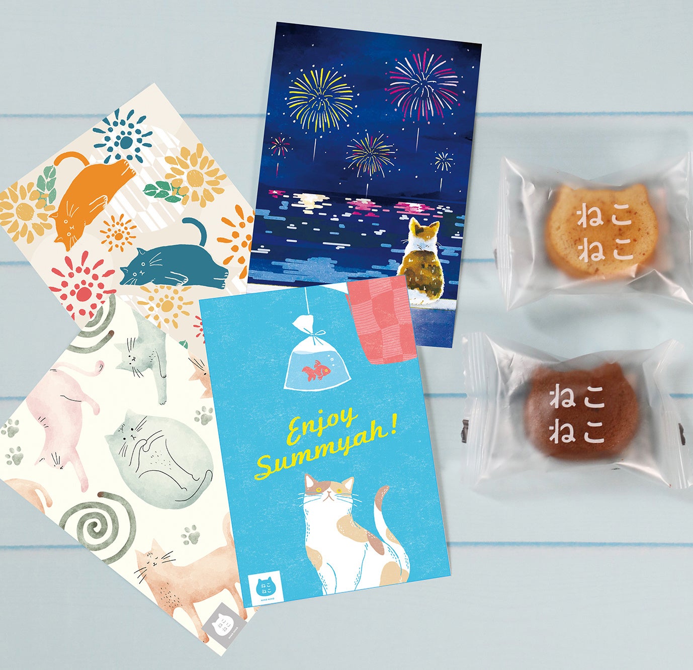 「ねこねこ」ブランドより、夏の風物詩をデザインしたポストカードセットを期間限定で新発売いたします。スイーツだけではなく、グッズとしてもお楽しみいただきたいという想いより、イラストが異なる4種類のポストカードをご用意いたしました。夏を思わせる爽やかな可愛らしいポストカード1枚と、「ねこねこ」で人気の焼き菓子『ふぃにゃんシェ(プレーン・ココア)』が1個ずつセットに。ポストカードはインテリアとして飾ったり、しおりの代わりとして本や手帳などに挟んだりと、用途は様々。ねこがあなたの日常に寄り添い、癒しをもたらします。ねこ好きさんへ、夏のギフトとしてお贈りいただいてもおすすめです。