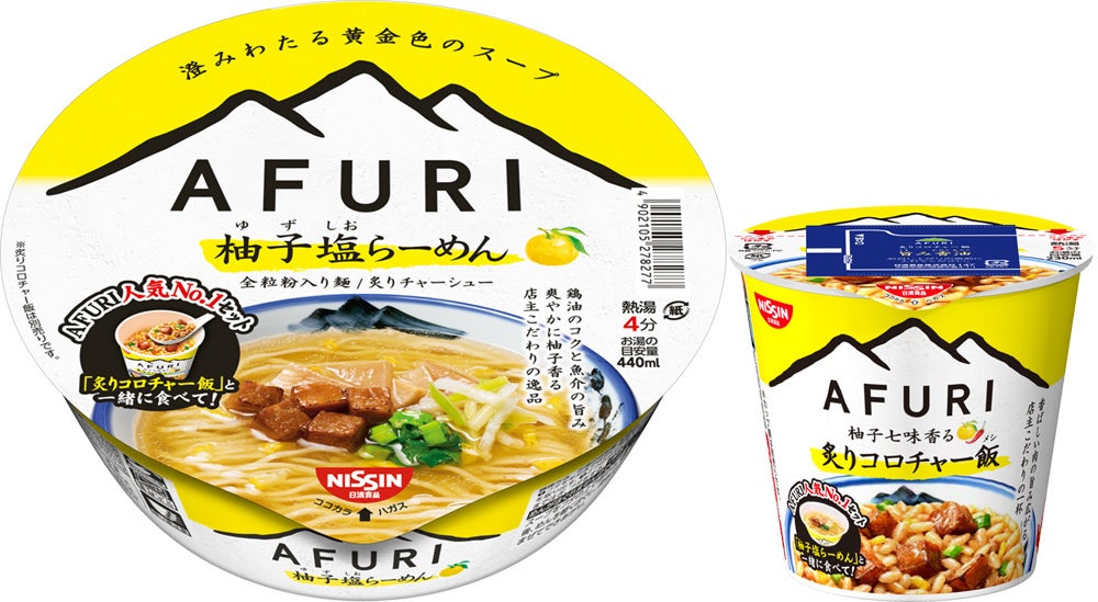 期間中、AFURI恵比寿にて『柚子塩らーめんと炙りコロチャーシュー飯のセット』をご注文の方に、オフィスやご自宅でもお湯を入れるだけで楽しめる、日清食品[柚子塩らーめん/炙りコロチャー飯]をプレゼント!