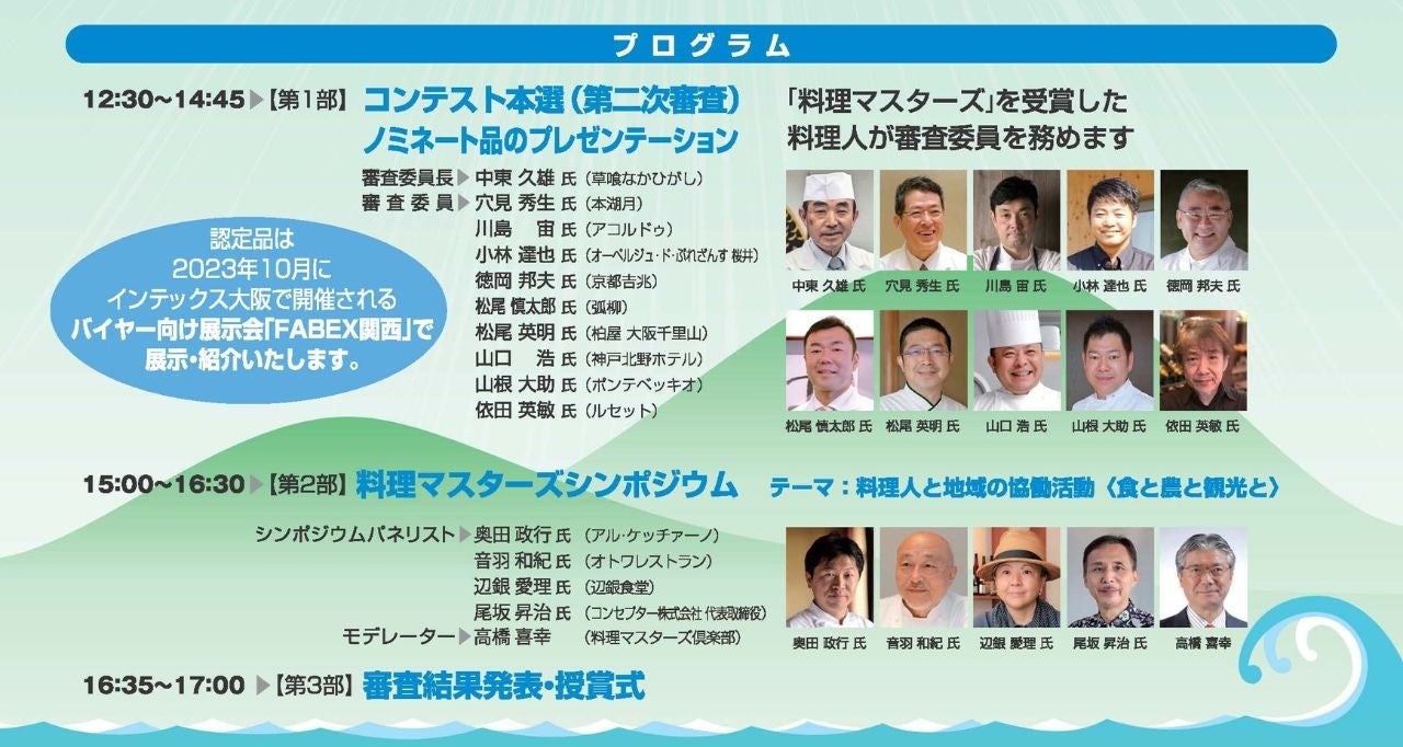 当コンテストは、「食」の専門家である料理マスターズが、食材の付加価値化に取り組む生産者に対して最善の手法を見つけるもので、認定品は2023年10月「FABEX関西」にて展示・紹介されます。また、当日は料理マスターズによるシンポジウムも開かれます。