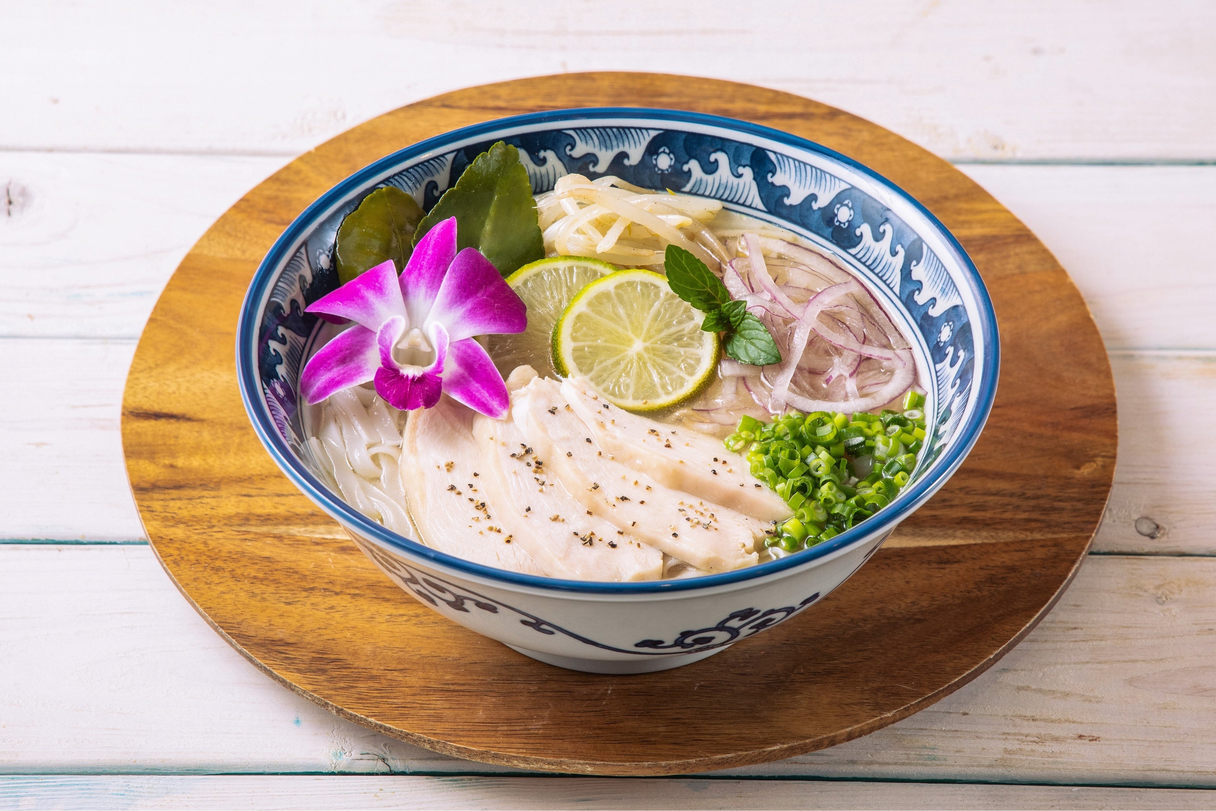 「清湯(チンタン)」と呼ばれる鶏ガラを使用した上品な香りと鶏の旨味を凝縮したクリアスープと、つるつるモチモチのライスヌードルが特徴のフォーです。