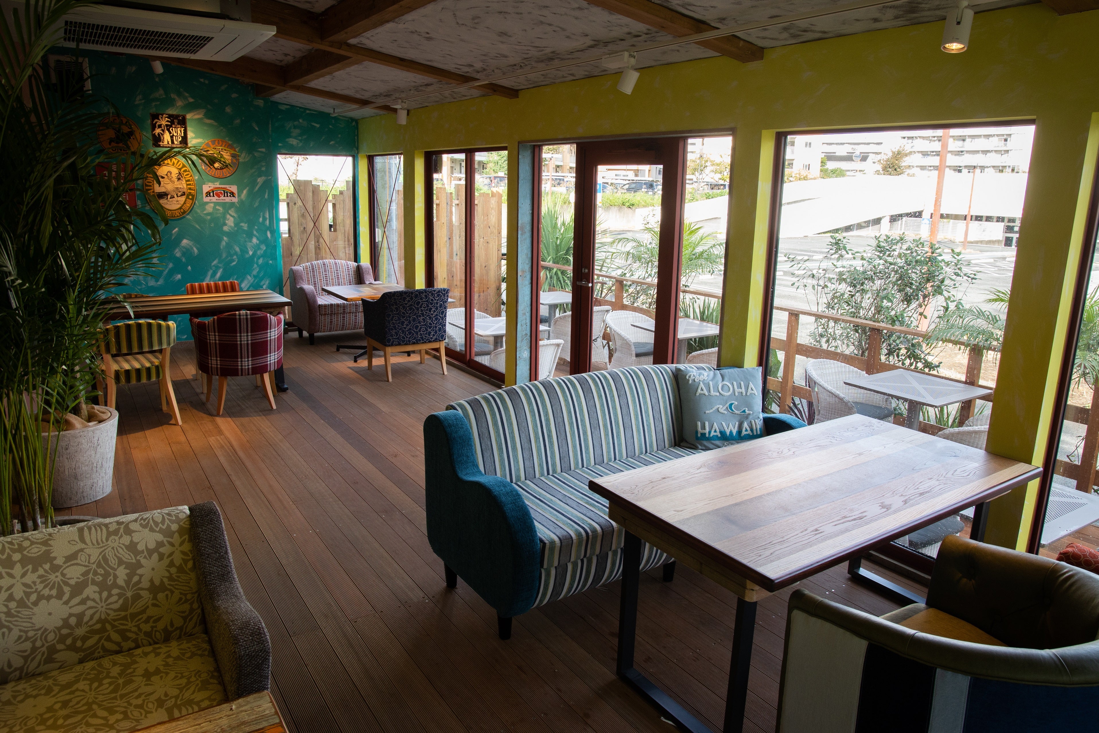カラフルなハワイアン雑貨やサーフボードが飾られ、遊び心のあるソファやテーブルなどのこだわりのインテリアが、まるで、ハワイのローカルのリビングにいるような雰囲気を演出します。ゆったりとくつろげる空間で、日本にいながらハワイ気分を味わえます。