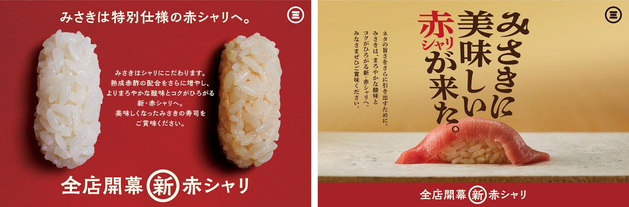 「回転寿司みさき」では、2023年3月から“赤シャリ”をリニューアルいたしました。赤酢を合わせたシャリのことをいう“赤シャリ”は、ネタの旨味を引き出し、寿司の旨さを決める重要な要素です。3月のリニューアルでは、2年間じっくりと熟成させた酒粕を原料とした赤酢の割合を増やし、まろやかな酸味とコク・風味を感じられるように独自の酢の配合を行ったこだわりの“赤シャリ”でご提供をしています。