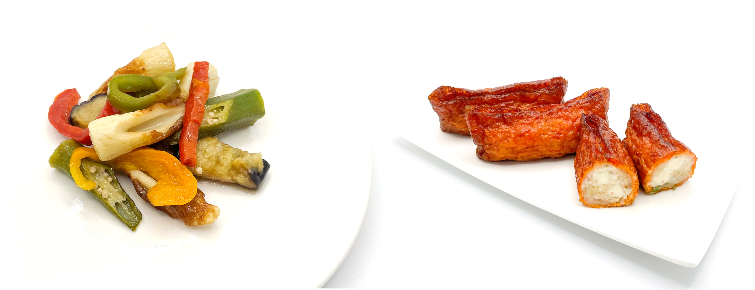 『夏野菜と竹輪の南蛮漬け』は、夏野菜の茄子、オクラ、3色ピーマンと竹輪を甘酸っぱいお酢に和えた南蛮漬けで、食欲が下がりがちなジメジメした梅雨の季節でもさっぱりとお召し上がりいただけます。稲荷寿司風の『一味入り ねぎマヨ稲荷』は、一味の入った真っ赤な稲荷揚げにネギとマヨをアクセントにしたお魚すり身を詰めた一品です。お酒のおつまみとしてはもちろん、うどんや蕎麦の付け合わせとしても相性抜群です。ぜひご賞味ください。