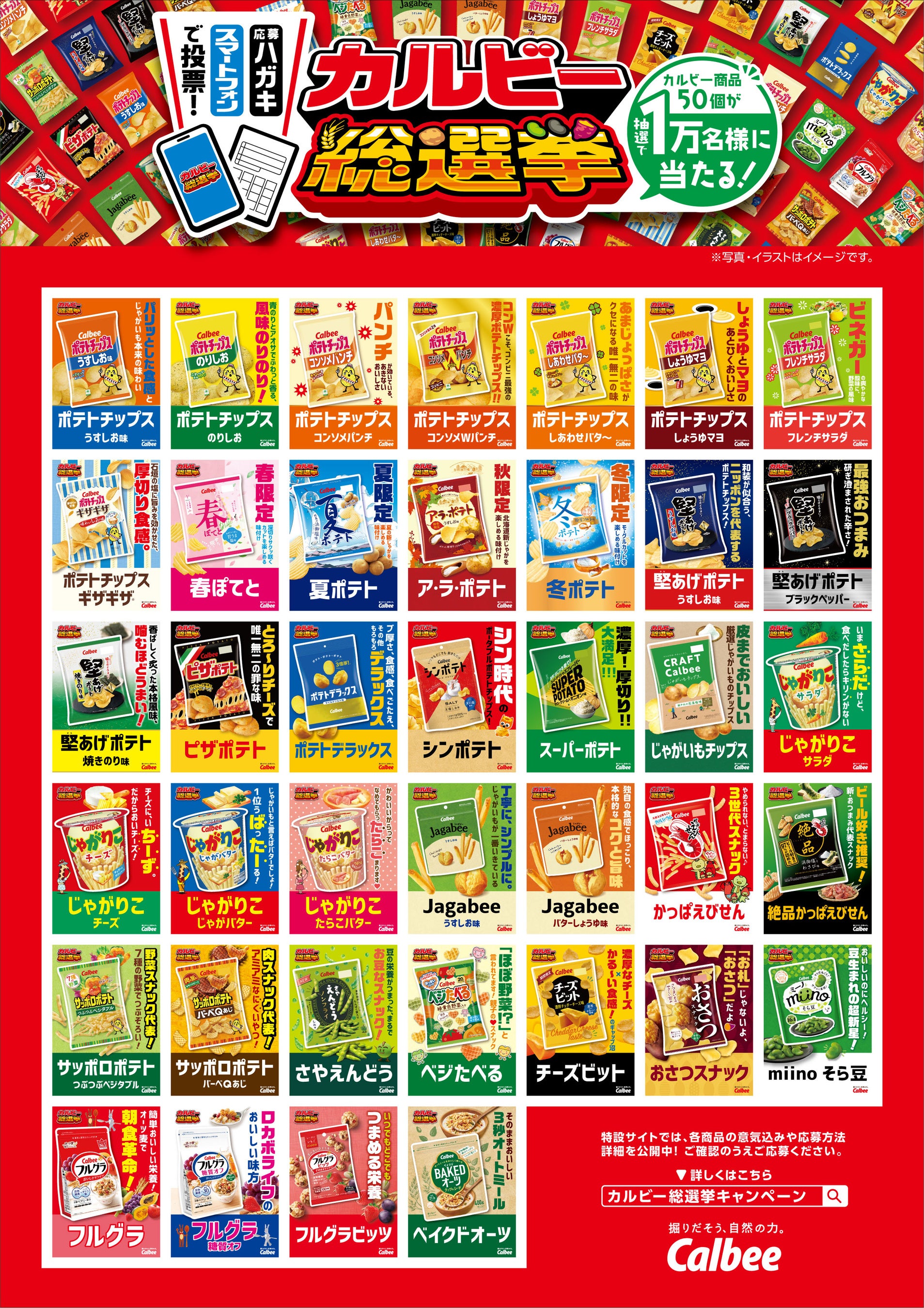 カルビーでは、全商品※を対象に人気商品を決めるキャンペーン『カルビー総選挙』を2023年3月13日(月)より開催中です。スマートフォンアプリ「カルビー ルビープログラム」やハガキで投票可能で、投票した方の中から抽選で1万名様に商品50個の詰め合わせが当たります。期間中は担当者が様々な形で各商品の魅力をPRしていく予定です。 ※ 応募券が付いたカルビーの商品