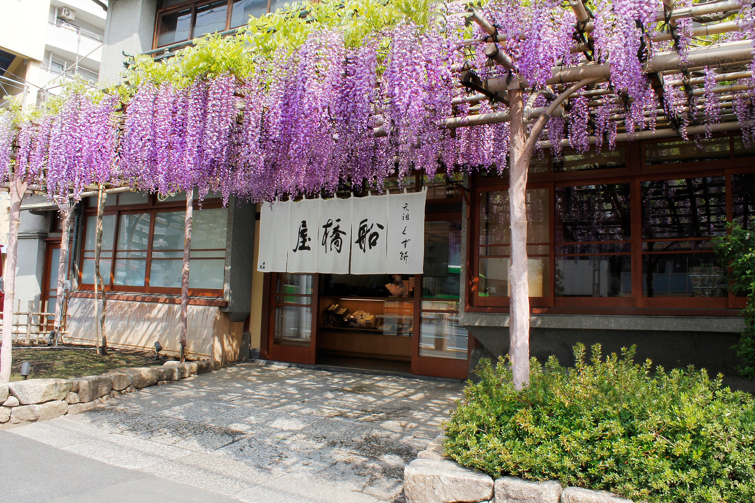 亀戸天神は東京一の藤の名所といわれ、時期になると多くの人々で賑わいます。船橋屋は1805年の江戸時代に亀戸天神の境内で創業し、明治の初期には亀戸天神の隣へお店を構えました。亀戸天神前本店の店頭にも藤棚があり、古くから藤の花をお店のモチーフとしています。