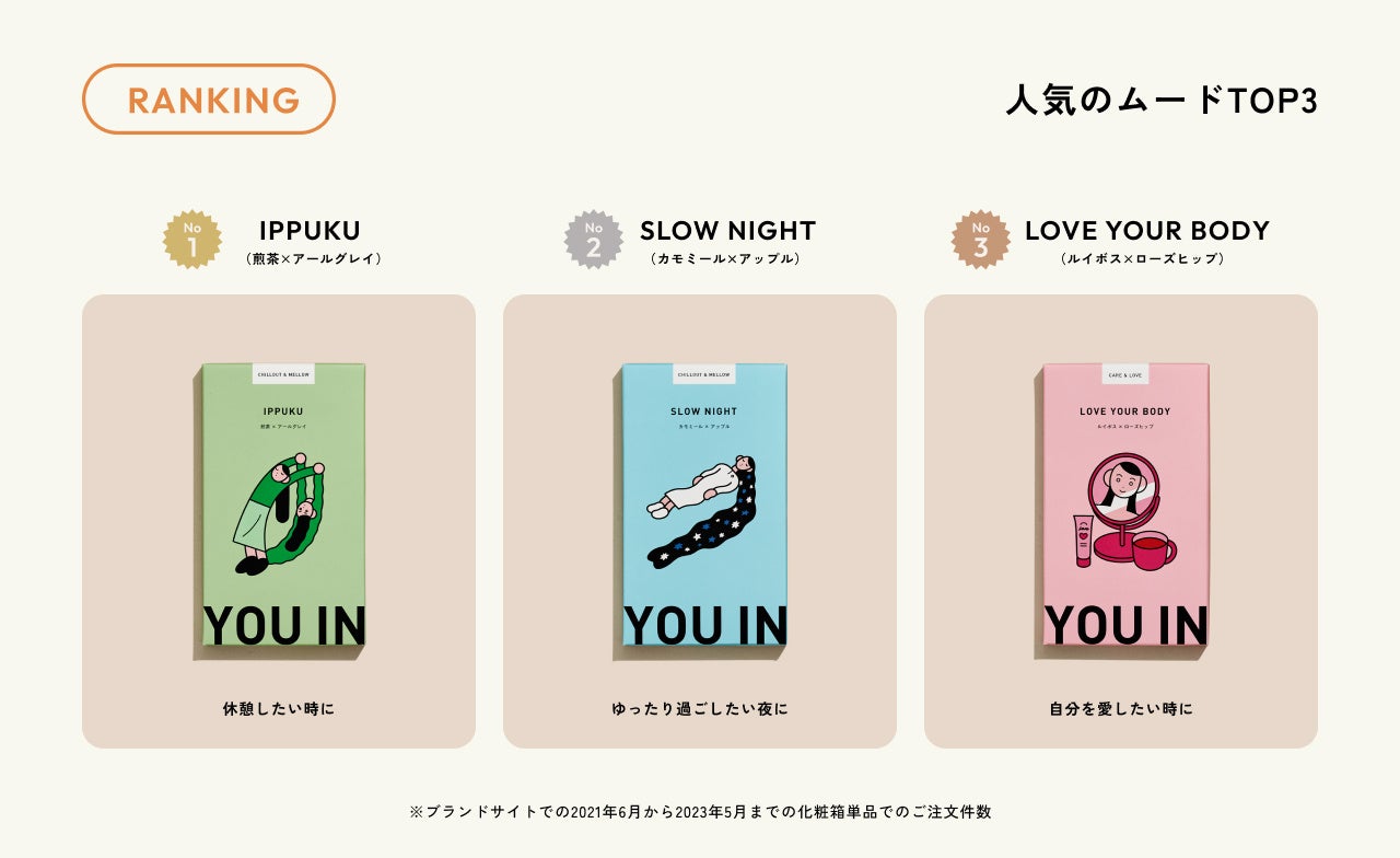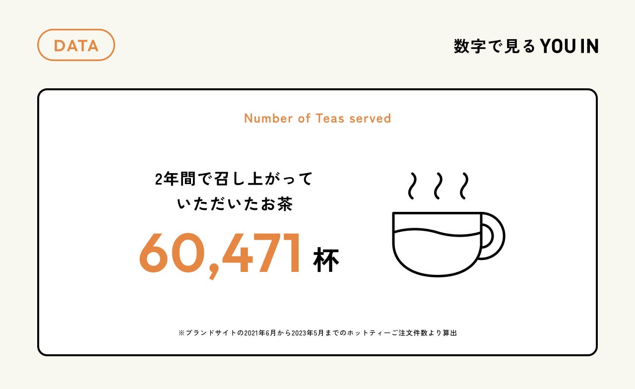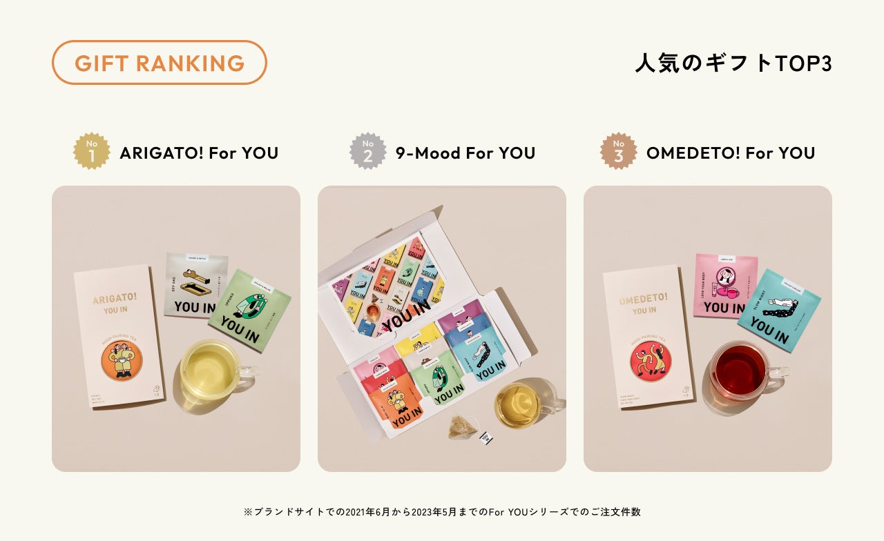 ・2021年6月14日にブランドサイトがOPENし、YOU INが誕生。陽な日も陰な日も、いつもあなたにペアリングできますように、そんな願いを込めて名付けられたYOU INは、様々なムードに寄り添うお茶”ムードペアリングティー”を展開し、たくさんのお客様にご愛顧いただいております。8月には水出しアイスティー、12月にはメッセージと一緒に贈ることができるティーレターギフトなど、新商品の販売を開始しました。