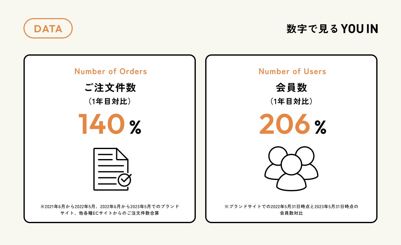 YOU INをお取り扱いいただく店舗や機会が増え、オフラインでのイベントなどによってご注文件数は右肩上がりの成長をしております。また、お客様は、トレンド感度の高い20代〜30代の女性を中心にご愛顧いただいています。お客様をはじめ、YOU INに関わってくださっている全ての方に改めて感謝いたします。