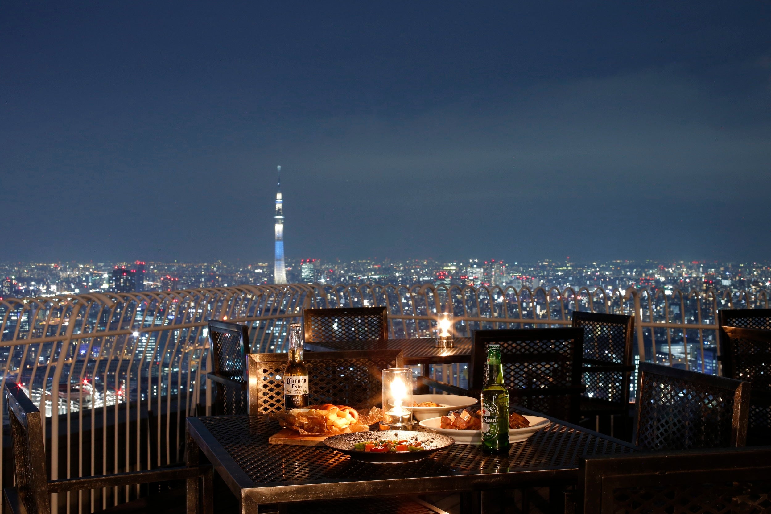 RESTAURANT LUKE with SKY LOUNGE(レストランルーク ウィズ スカイラウンジ/築地)では東京タワー側とスカイツリー側の2面に広がる地上221mのテラスでビアテラスをお楽しみいただけます。40種類を超えるドリンクメニューには、「隅田川ブルーイングペールエール」やイタリアンビールの「ペローニ ナストロ アズーロ」を生ビールでご用意。国産牛フィレや美明豚、魚介などの料理と共にお楽しみください。