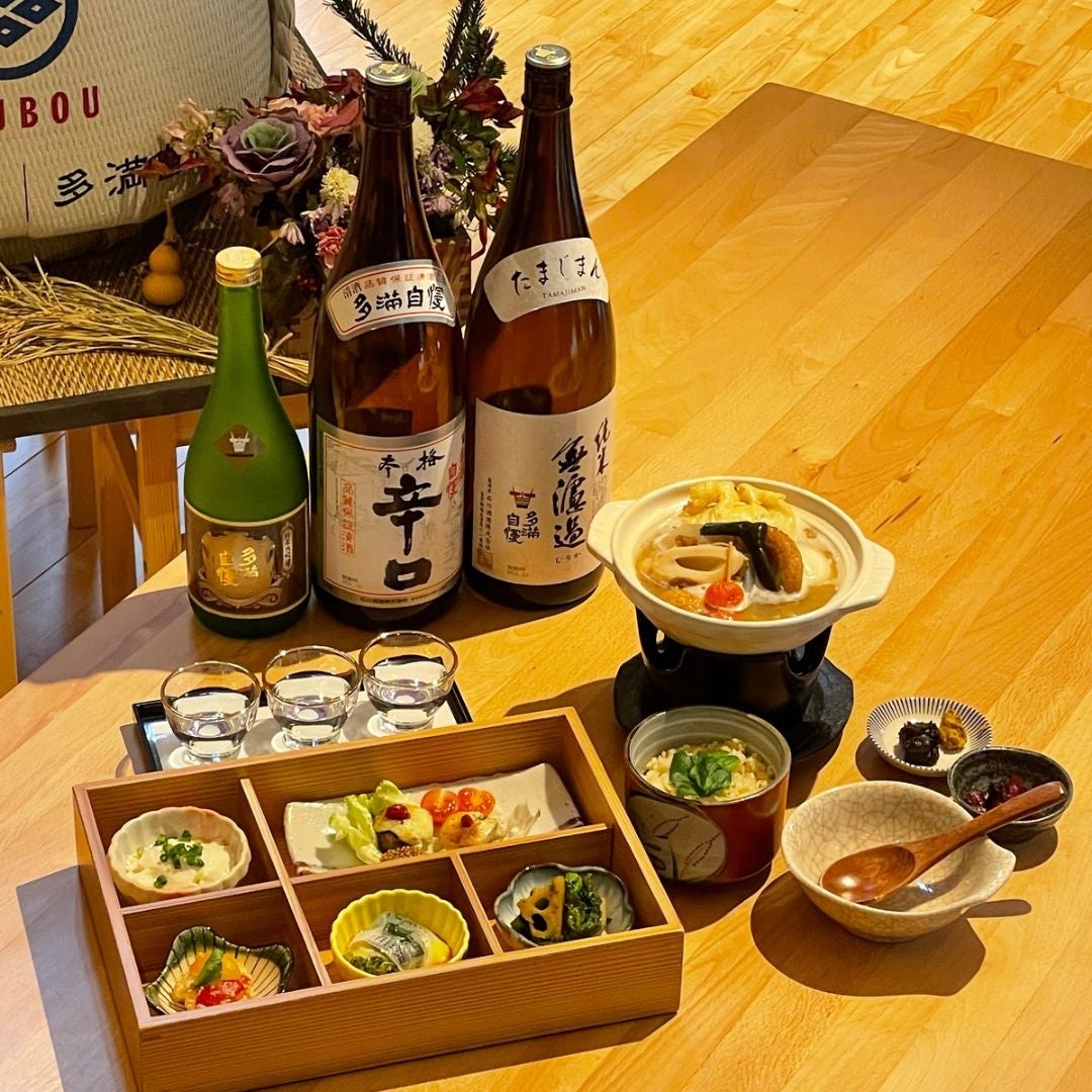 利酒セミナーの後は、杜氏を囲んで「日本酒」「塩麹」などを使った5品の特別ディナーコース(木箱前菜5種・一品料理・メイン・食事・デザート)を熱燗や冷酒などの違いや料理との相性を楽しみながらご堪能いただきます。(※写真はイメージです。)