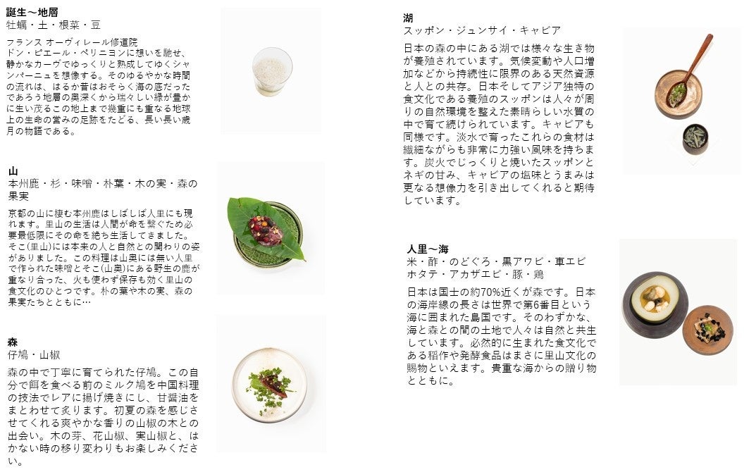 日本の里山にある豊かな食文化と先人たちの知恵を探求し、自身のフィルターを通して料理で表現する、”Innovative Satoyama Cuisine”イノベーティヴ里山キュイジーヌ “( 革新的 里山料理 ) というNARISAWA 独自のジャンルを確立。自然への敬意を込め、心と体に有益で、環境に配慮した持続可能な美食“Beneficial and Sustainable Gastronomy” を発信し続けている。