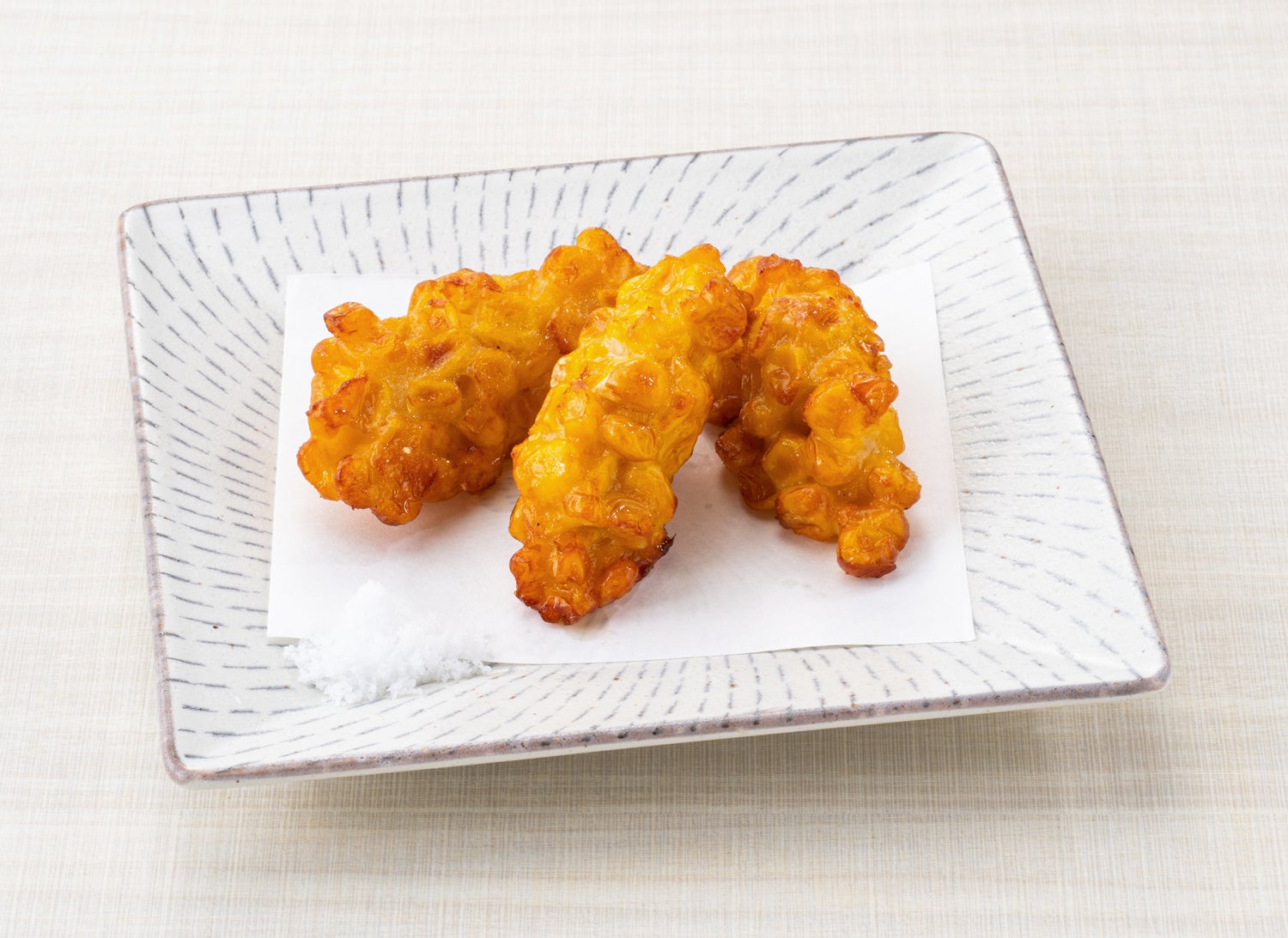 醤油・砂糖などで甘辛く味付けした「あとひき揚げ」。食べると後を引くことから「あとひき揚げ」と名付けられました。熱々の油でじっくりと揚げることで、とうもろこしの甘みを最大限に引き出しました。