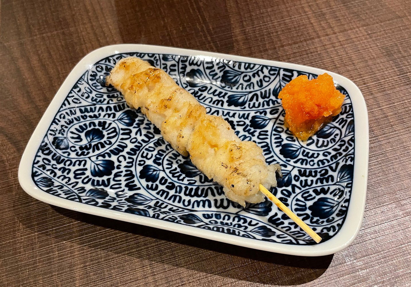 炭火でじっくりと焼き上げ、パリッとした表面とジューシーな中身が絶妙なバランスの一品。ハモの串焼きはそのままでも美味しいですが、添えられた梅おろしと一緒にお召しあがりいただくと、より一層豊かな風味がお楽しみいただけます。
