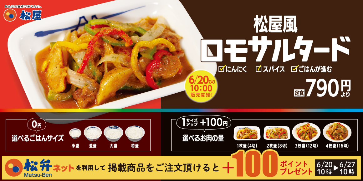 6月20日10時~6月27日10時まで、松弁ネットを利用して「“松屋風”ロモサルタード定食」関連商品のお弁当をご注文頂けると、100ポイントプレゼントいたします。