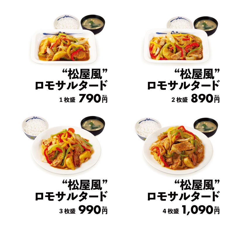 商品名 ”松屋風”ロモサルタード定食1枚盛 790円 ”松屋風”ロモサルタード定食2枚盛 890円 ”松屋風”ロモサルタード定食3枚盛 990円 ”松屋風”ロモサルタード定食4枚盛 1,090円 ※お持ち帰りいただけます。お持ち帰りにみそ汁は付きません。 お持ち帰りの場合、みそ汁は別途60円でお求めいただけます。 ※税込み価格です。 発売日 2023年6月20日(火)午前10時 ~ 対象店舗 一部店舗を除く全国の松屋 |