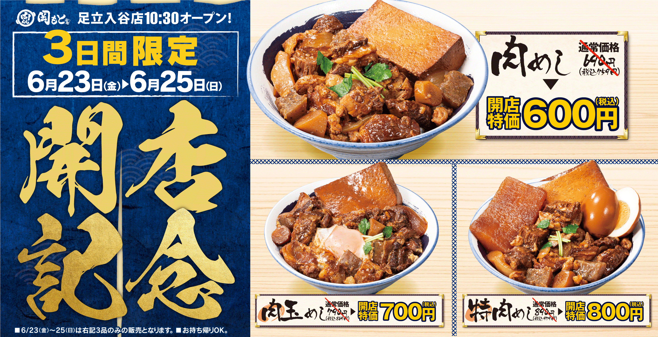 「肉めし岡もと 足立入谷店」は、カツ丼でも牛丼でも親子丼でもない”新しい肉丼”を気軽に味わっていただけるよう、6月23日(金)から6月25日(日)の3日間は看板メニューの「肉めし」をはじめ、代表的な3品をとってもお得な開店特価で販売いたします。