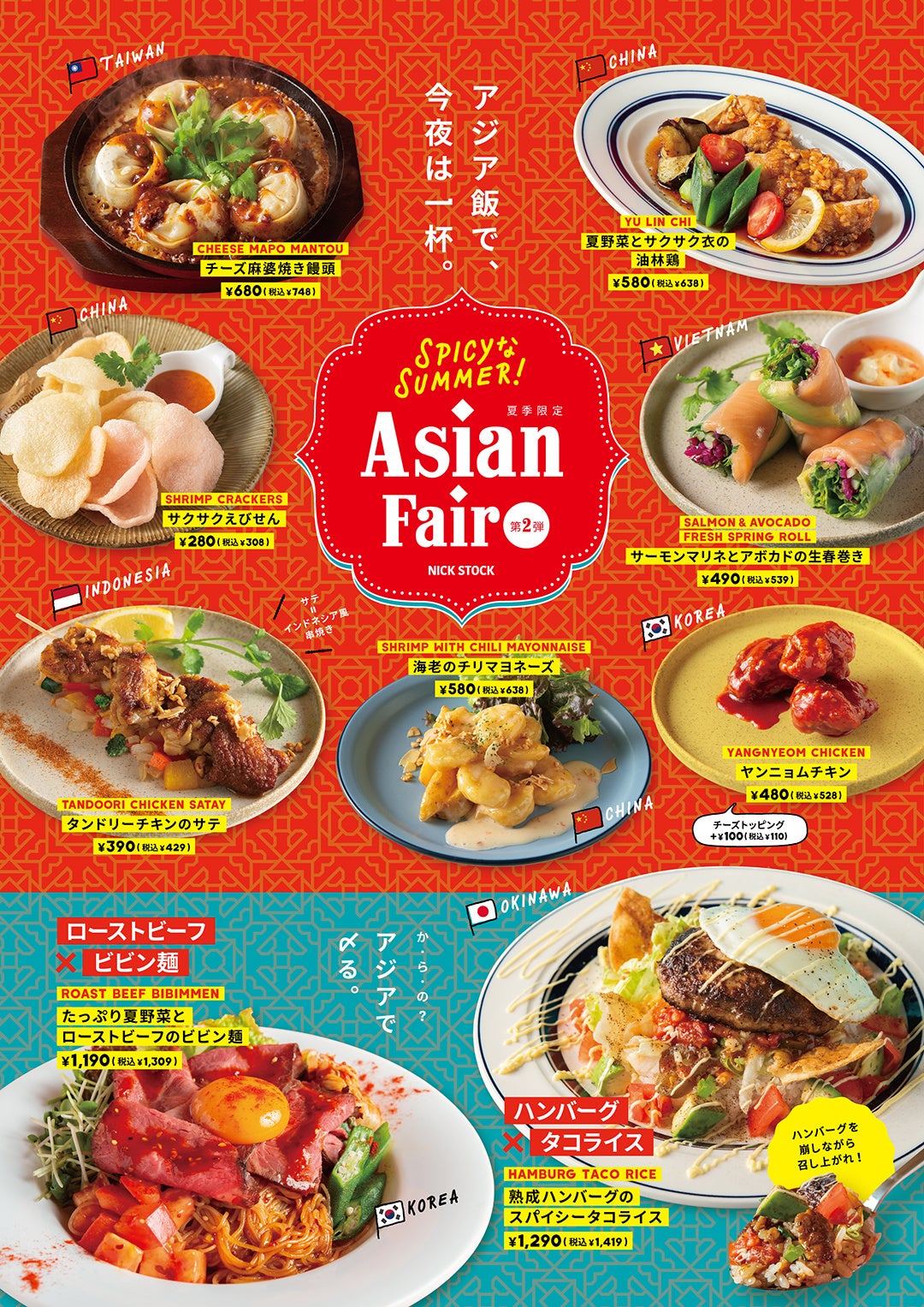第1弾で好評だったメニューに加え、ニックストックが得意とする“肉が主役”のスパイシーな夏のアジアングルメが新登場します。アジア各国のグルメからインスパイアされたニックストックオリジナルの全9品の期間限定メニューをお楽しみください。