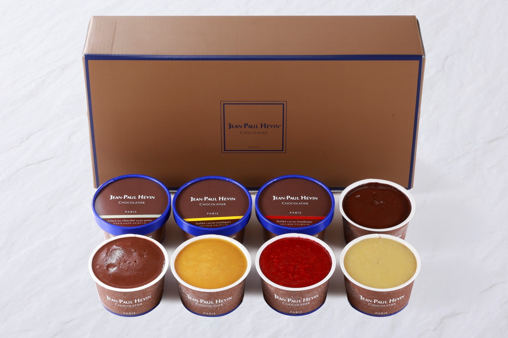 カカオの風味が際立つフルーツソースを合せた3種類の新作ソルベ&アイス「ソルベ カカオ エキゾティック」「ソルベ カカオ フランボワーズ」「グラス オ ショコラ ユズ ポワール」(各2個)と、濃厚なビターチョコレートアイス「グラス オ ショコラ JPH」と4種のスパイスとオレンジコンフィがアクセントのビターチョコレートソルベ「ソルベ カカオ ゼピス」(各1個)の詰合せ。